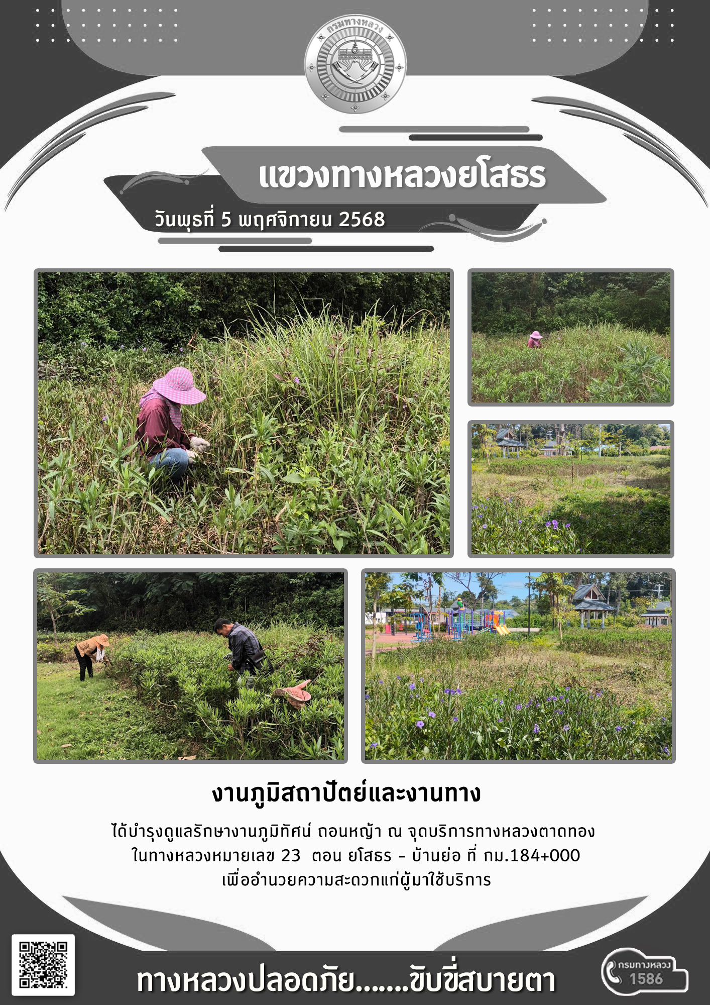 วันพุธที่ 5 พฤศจิกายน 2568 งานภูมิสถาปัตย์และงานทาง ได้บำรุงดูแลรักษางานภูมิทัศน์ ถอนหญ้า ณ จุดบริการทางหลวงตาดทอง ในทางหลวงหมายเลข 23 ตอน ยโสธร - บ้านย่อ ที่ กม.184+000 เพื่ออำนวยความสะดวกแก่ผู้มาใช้บริการ