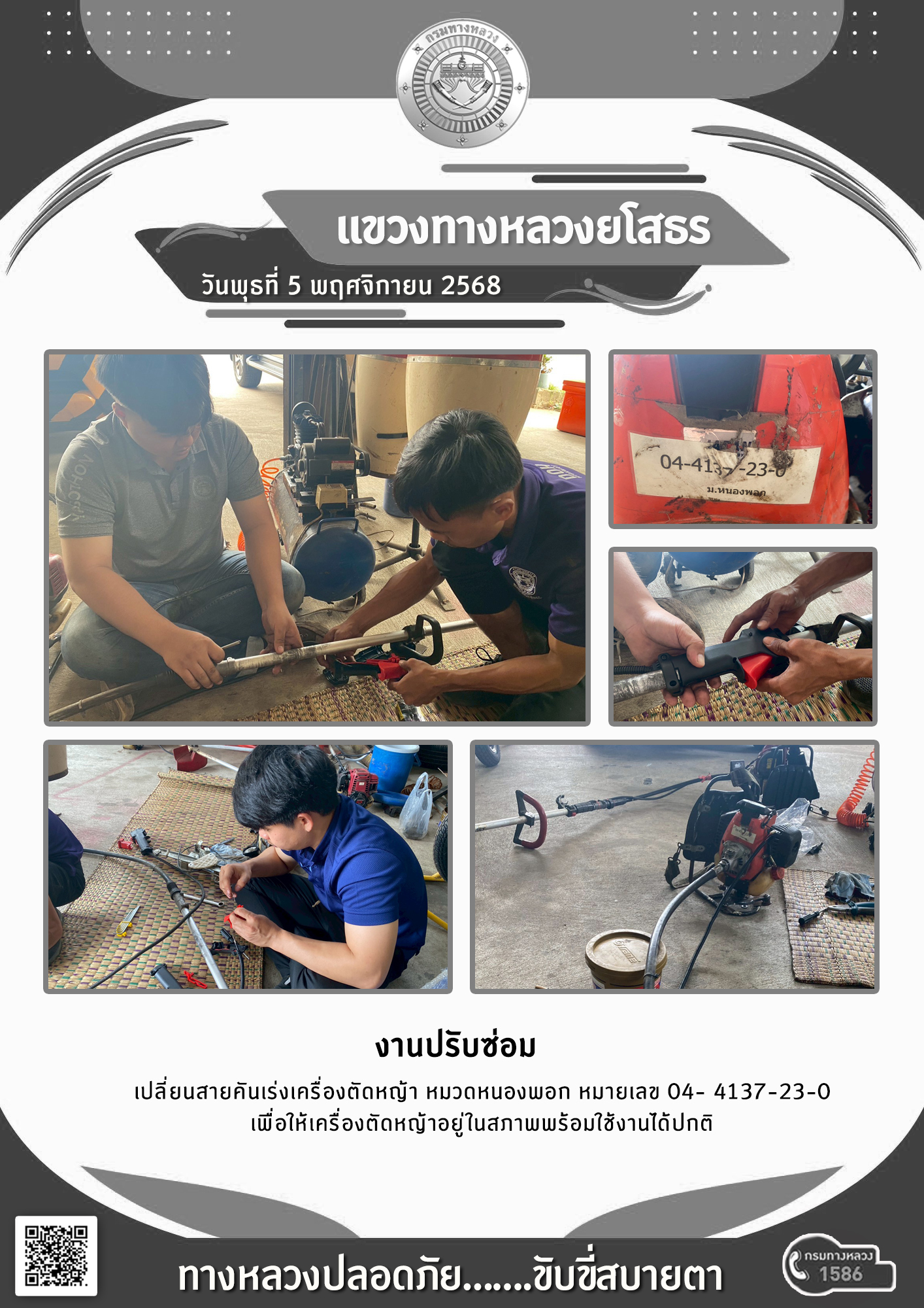 - [10:21] ทั่วไป วันอังคารที่ 31 มีนาคม 2569 งานอำนวยความปลอดภัย ได้ดำเนินการตัดหญ้า ทำความสะอาดภายในบริเวณแขวงทางหลวงยโสธร