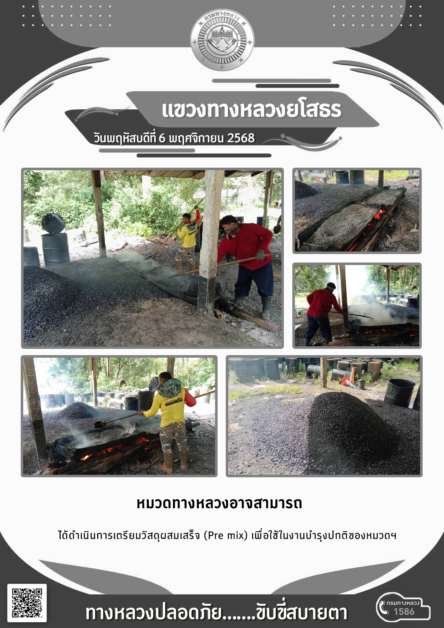 วันพฤหัสบดีที่ 6 พฤศจิกายน 2568 หมวดทางหลวงอาจสามารถ ได้ดำเนินการเตรียมวัสดุผสมเสร็จ (Pre mix) เพื่อใช้ในงานบำรุงปกติของหมวดฯ