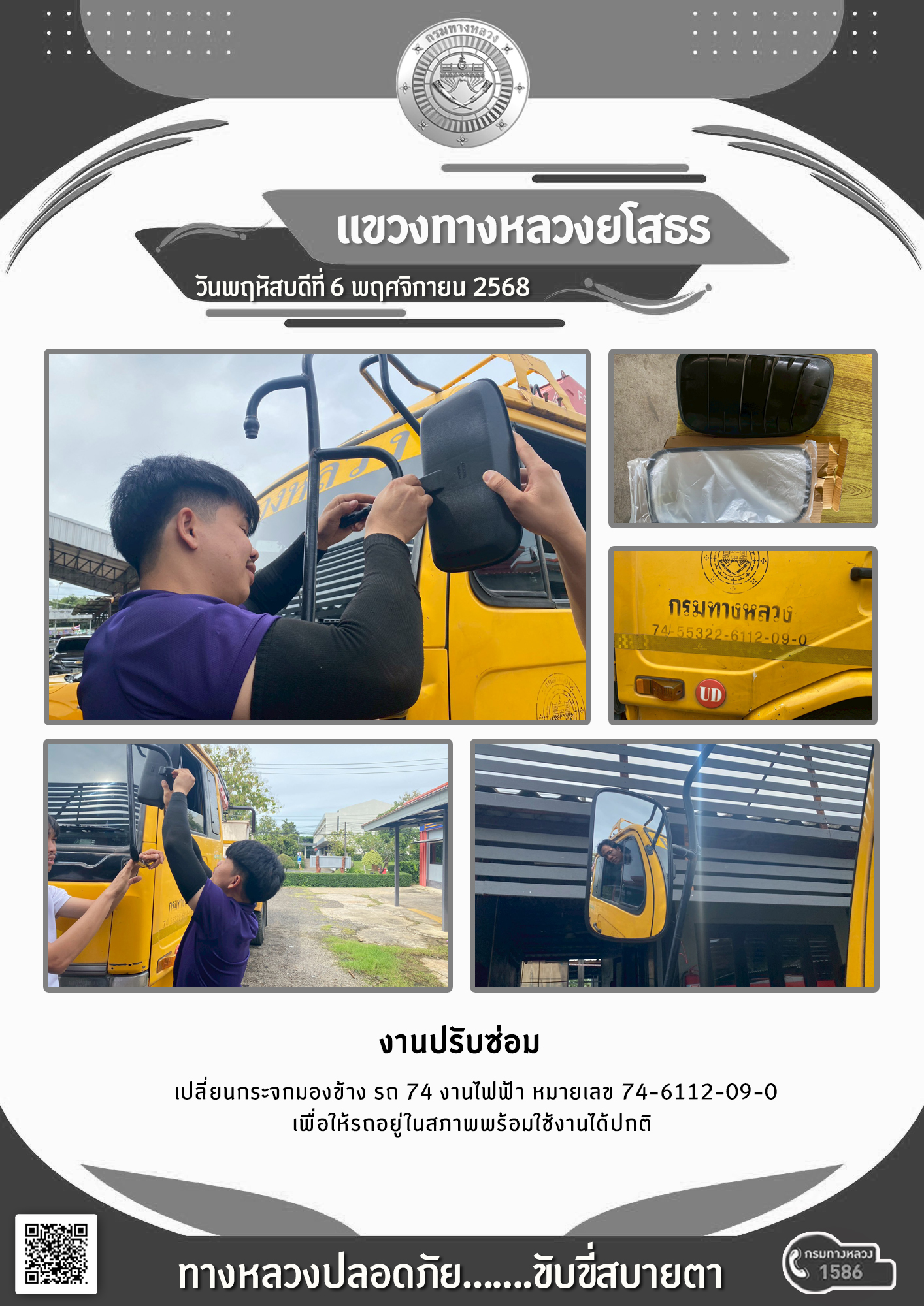 วันพฤหัสบดีที่ 6 พฤศจิกายน 2568 งานปรับซ่อม เปลี่ยนกระจกมองข้างรถ หมายเลข 74-6112-09-0 เพื่อให้รถอยู่ในสภาพพร้อมใช้งานได้ปกติ