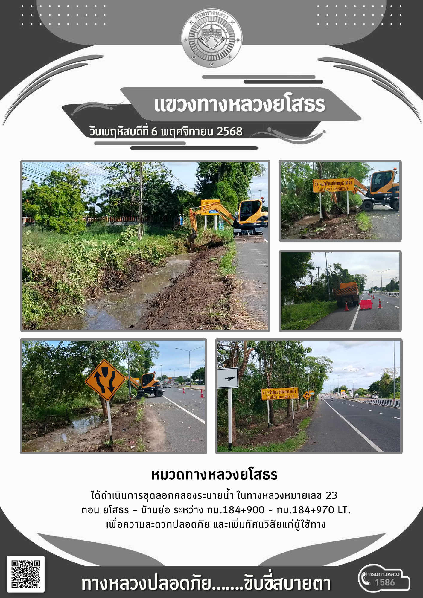 วันพฤหัสบดีที่ 6 พฤศจิกายน 2568 หมวดทางหลวงยโสธร ได้ดำเนินการขุดลอกคลองระบายน้ำ ในทางหลวงหมายเลข 23 ตอน ยโสธร - บ้านย่อ ระหว่าง กม.184+900 - กม.184+970 LT. เพื่อความสะดวกปลอดภัย และเพิ่มทัศนวิสัยแก่ผู้ใช้ทาง