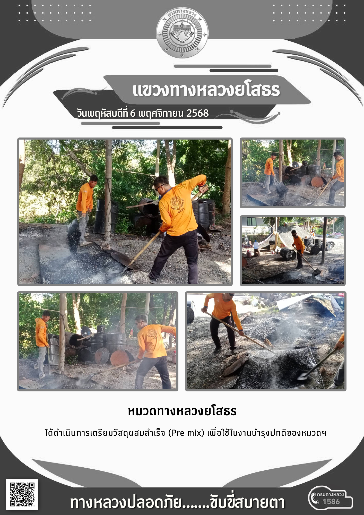 วันพฤหัสบดีที่ 6 พฤศจิกายน 2568 หมวดทางหลวงยโสธร ได้ดำเนินการเตรียมวัสดุผสมสำเร็จ (Pre mix) เพื่อใช้ในงานบำรุงปกติของหมวดฯ