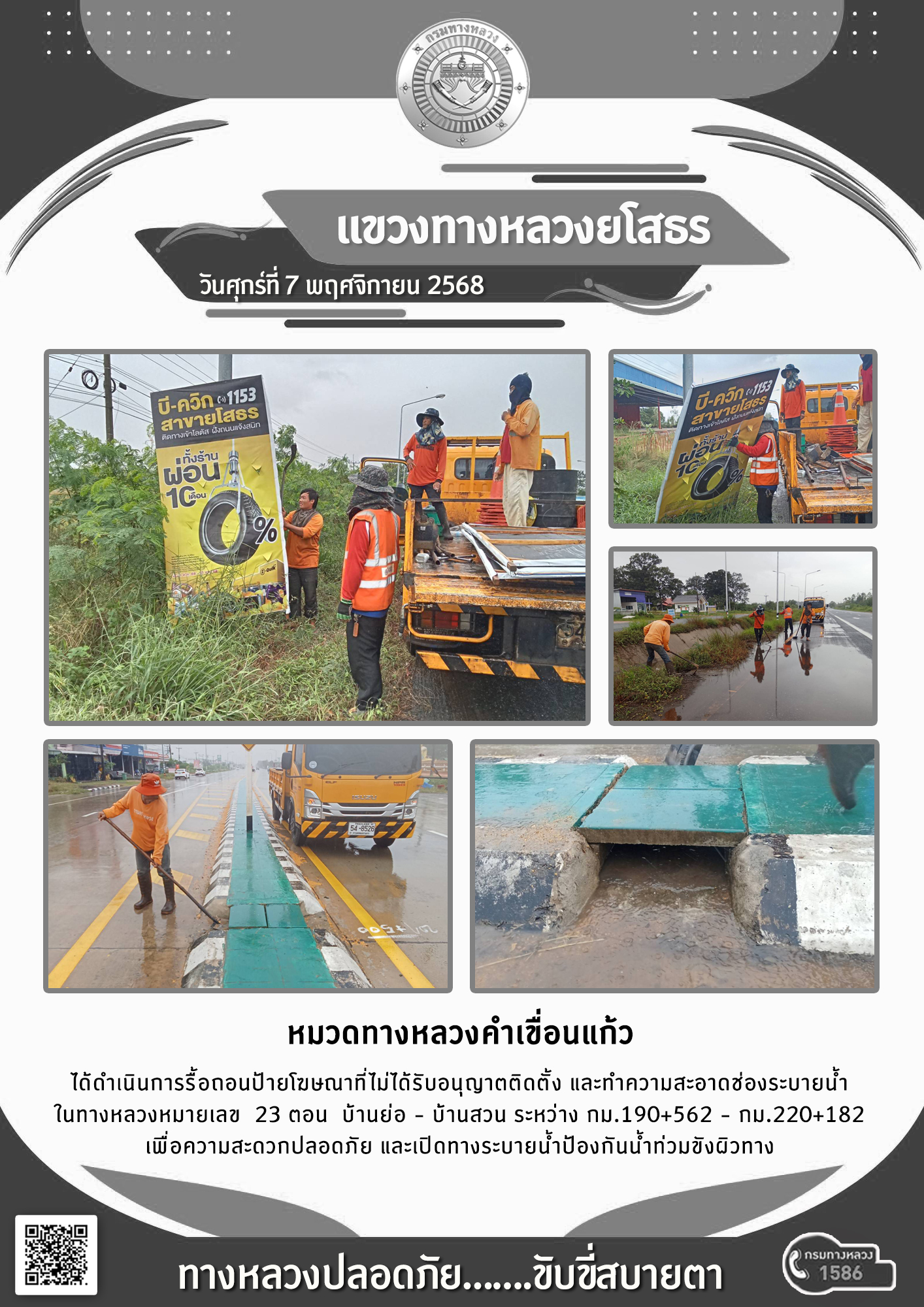วันศุกร์ที่ 7 พฤศจิกายน 2568 หมวดทางหลวงคำเขื่อนแก้ว ได้ดำเนินการรื้อถอนป้ายโฆษณาที่ไม่ได้รับอนุญาตติดตั้ง และทำความสะอาดช่องระบายน้ำ ในทางหลวงหมายเลข 23 ตอน บ้านย่อ - บ้านสวน ระหว่าง กม.190+562 - กม.220+182 เพื่อความสะดวกปลอดภัย และเปิดทางระบายน้ำป้