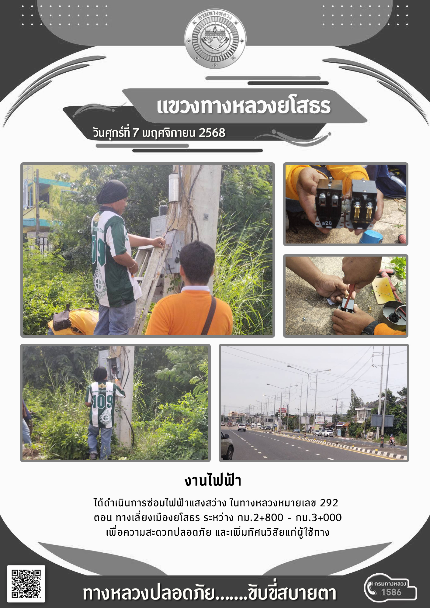 วันศุกร์ที่ 7 พฤศจิกายน 2568 งานไฟฟ้า ได้ดำเนินการซ่อมไฟฟ้าแสงสว่าง ในทางหลวงหมายเลข 292 ตอน ทางเลี่ยงเมืองยโสธร ระหว่าง กม.2+800 - กม.3+000 เพื่อความสะดวกปลอดภัย และเพิ่มทัศนวิสัยแก่ผู้ใช้ทาง