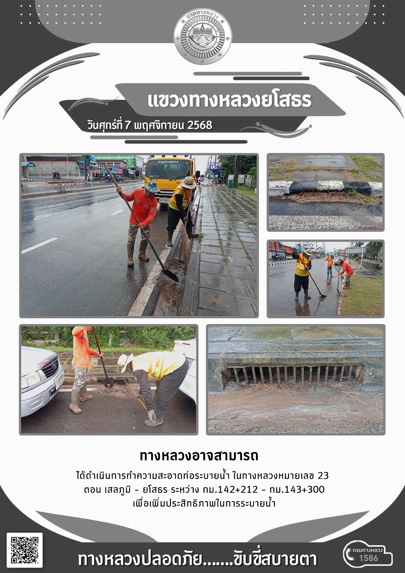 วันศุกร์ที่ 7 พฤศจิกายน 2568 ทางหลวงอาจสามารถ ได้ดำเนินการทำความสะอาดท่อระบายน้ำ ในทางหลวงหมายเลข 23 ตอน เสลภูมิ - ยโสธร ระหว่าง กม.142+212 - กม.143+300 เพื่อเพิ่มประสิทธิภาพในการระบายน้ำ