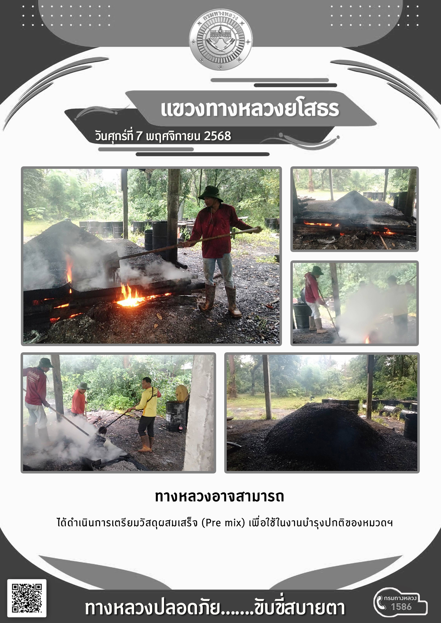 วันศุกร์ที่ 7 พฤศจิกายน 2568 ทางหลวงอาจสามารถ ได้ดำเนินการเตรียมวัสดุผสมเสร็จ (Pre mix) เพื่อใช้ในงานบำรุงปกติของหมวดฯ