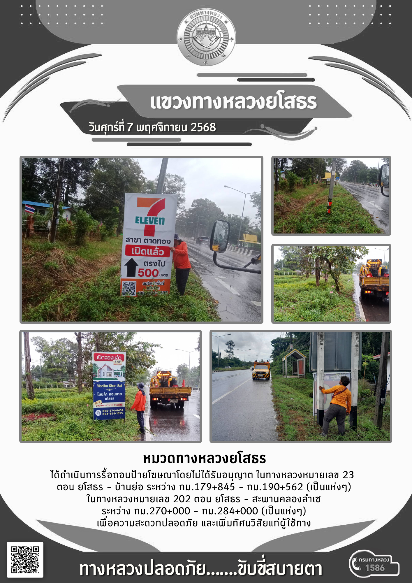 วันศุกร์ที่ 7 พฤศจิกายน 2568 หมวดทางหลวงยโสธร ได้ดำเนินการรื้อถอนป้ายโฆษณาโดยไม่ได้รับอนุญาต ใน ทล. 23 ตอน ยโสธร - บ้านย่อ ระหว่าง กม.179+845 - กม.190+562 (เป็นแห่งๆ) และ ทล. 202 ตอน ยโสธร - สะพานคลองลำเซ ระหว่าง กม.270+000 - กม.284+000 (เป็นแห่งๆ)