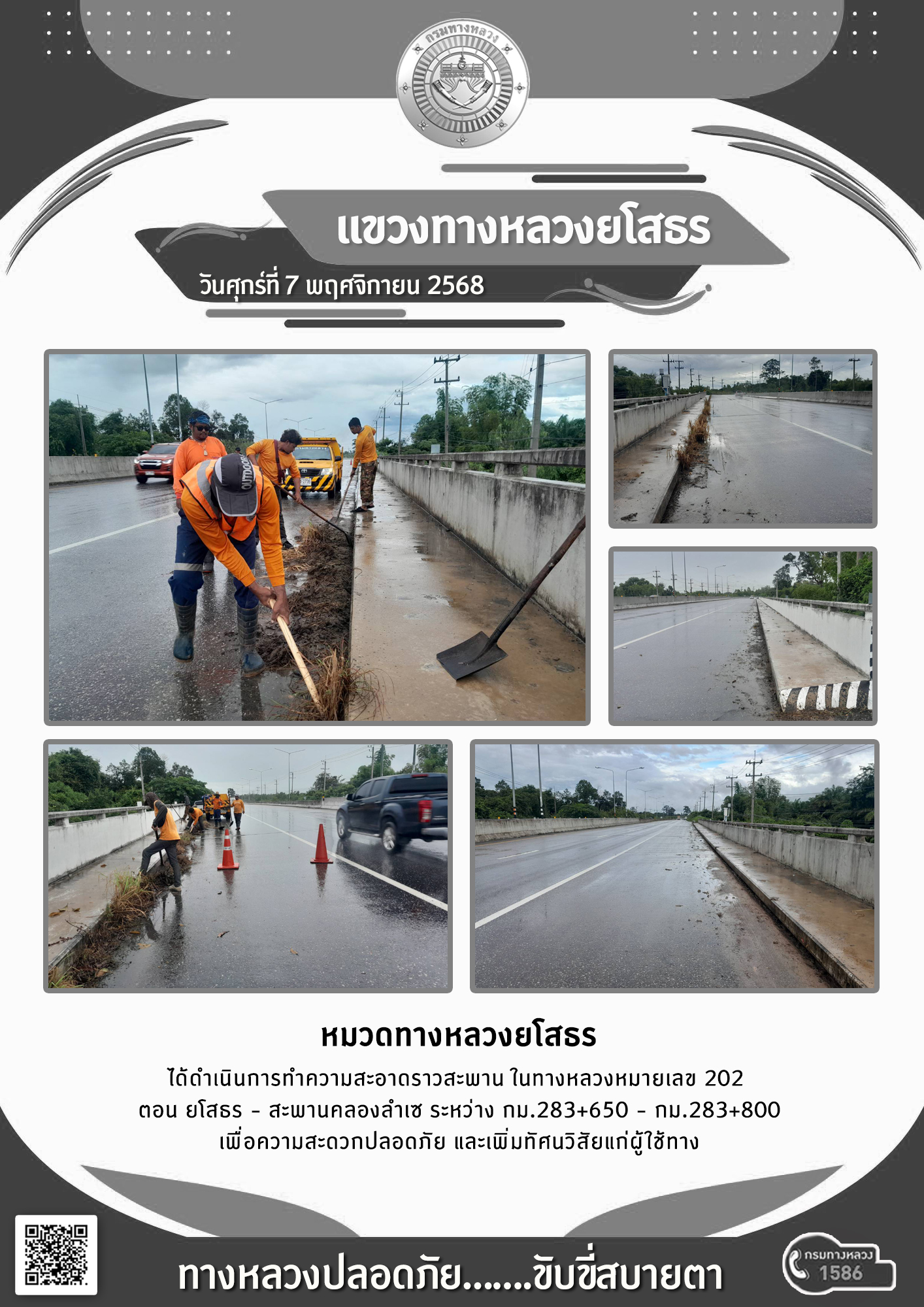 วันศุกร์ที่ 7 พฤศจิกายน 2568 หมวดทางหลวงยโสธร ได้ดำเนินการทำความสะอาดราวสะพาน ในทางหลวงหมายเลข 202 ตอน ยโสธร - สะพานคลองลำเซ ระหว่าง กม.283+650 - กม.283+800 เพื่อความสะดวกปลอดภัย และเพิ่มทัศนวิสัยแก่ผู้ใช้ทาง