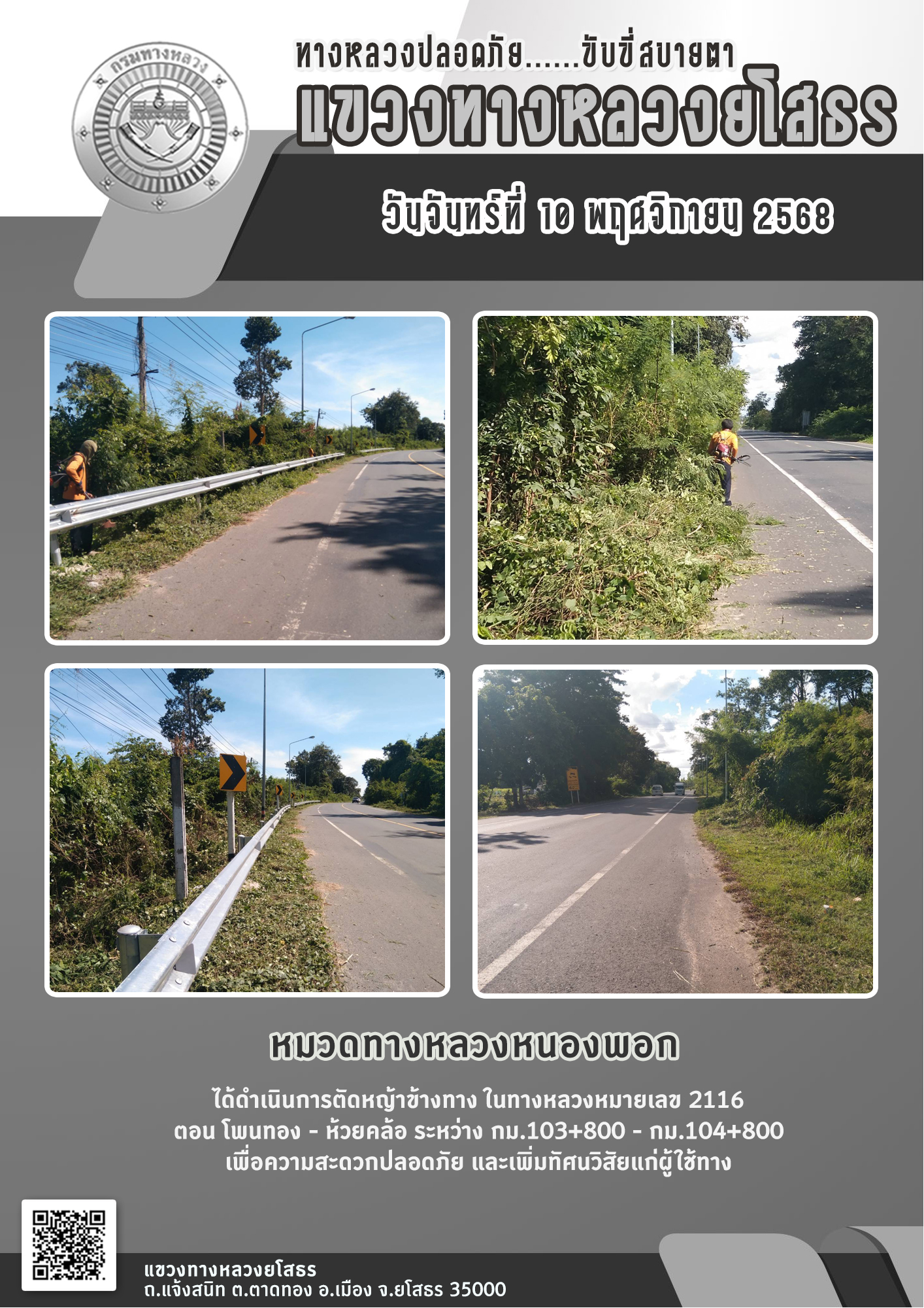 - [10:18] ทั่วไป วันอังคารที่ 31 มีนาคม 2569 หมวดทางหลวงหนองพอก ได้ดำเนินการตัดหญ้าข้างทาง ในทางหลวงหมายเลข 2116 ตอน โพนทอง - ห้วยคล้อ ระหว่าง กม.88+000 - กม.89+000 เพื่อความสะดวกปลอดภัย และเพิ่มทัศนวิสัยแก่ผู้ใช้ทาง