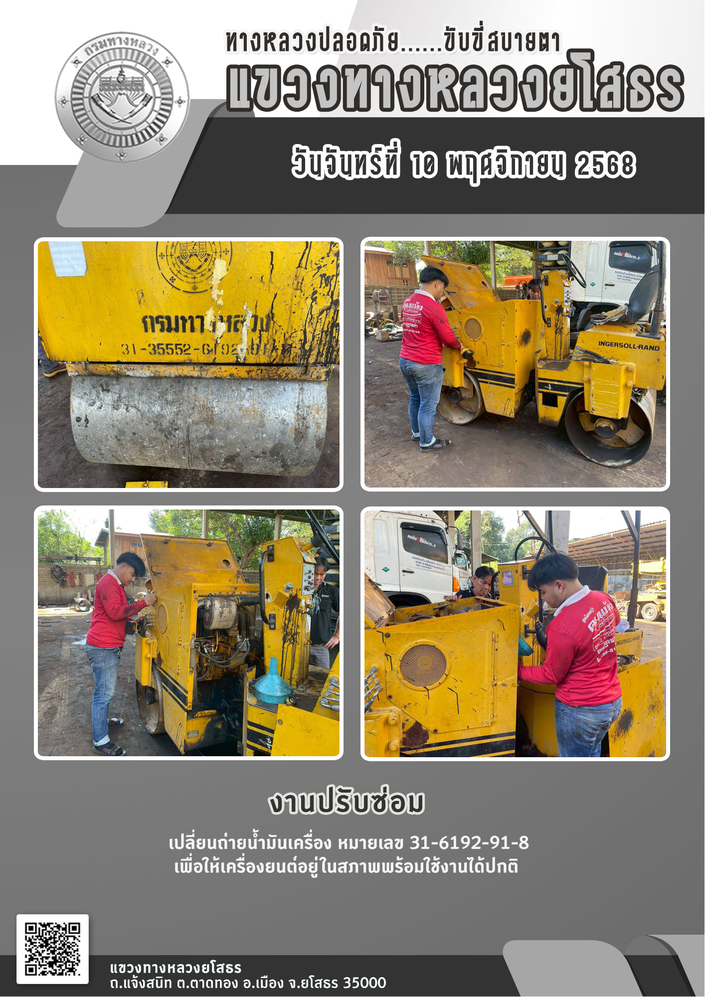 - [10:21] ทั่วไป วันอังคารที่ 31 มีนาคม 2569 งานอำนวยความปลอดภัย ได้ดำเนินการตัดหญ้า ทำความสะอาดภายในบริเวณแขวงทางหลวงยโสธร