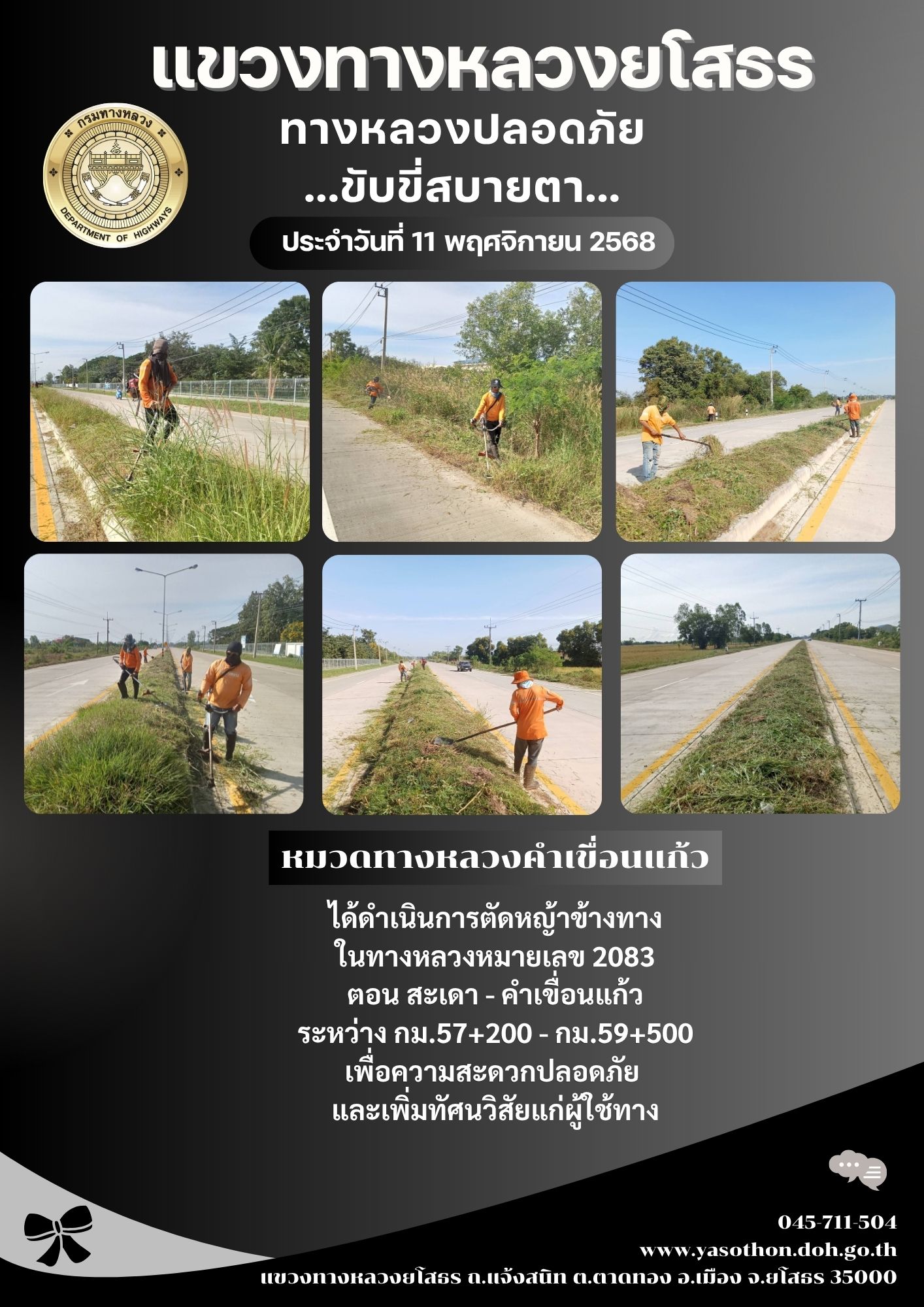 วันที่ 11 พฤศจิกายน 2568 หมวดทางหลวงคำเขื่อนแก้ว ได้ดำเนินการตัดหญ้าข้างทาง ในทางหลวงหมายเลข 2083 ตอน สะเดา - คำเขื่อนแก้ว ระหว่าง กม.57+200 - กม.59+500 เพื่อความสะดวกปลอดภัย และเพิ่มทัศนวิสัยแก่ผู้ใช้ทาง
