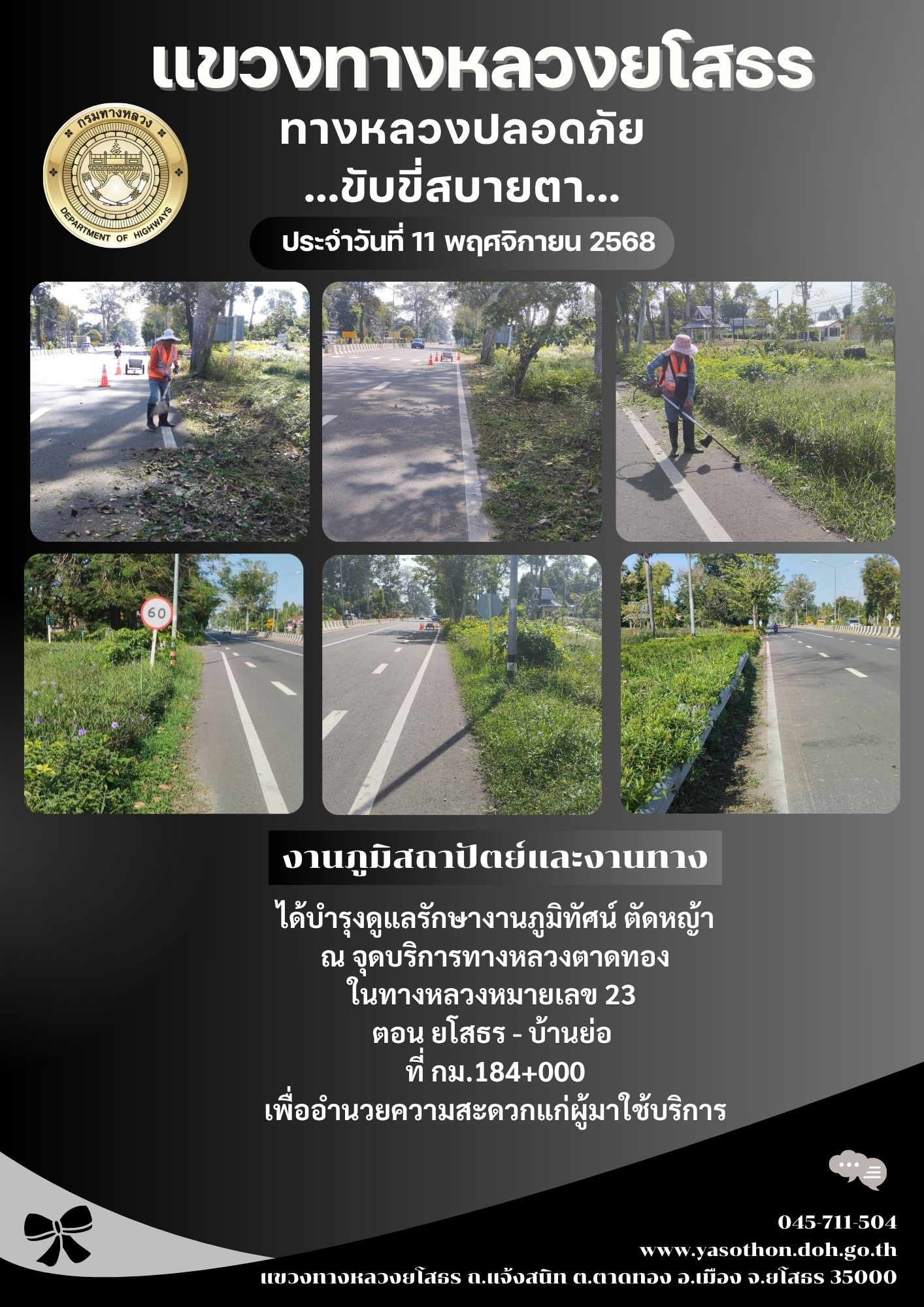 วันที่ 11 พฤศจิกายน 2568 งานภูมิสถาปัตย์และงานทาง ได้บำรุงดูแลรักษางานภูมิทัศน์ ตัดหญ้า ณ จุดบริการทางหลวงตาดทอง ในทางหลวงหมายเลข 23 ตอน ยโสธร - บ้านย่อ ที่ กม.184+000 เพื่ออำนวยความสะดวกแก่ผู้มาใช้บริการ