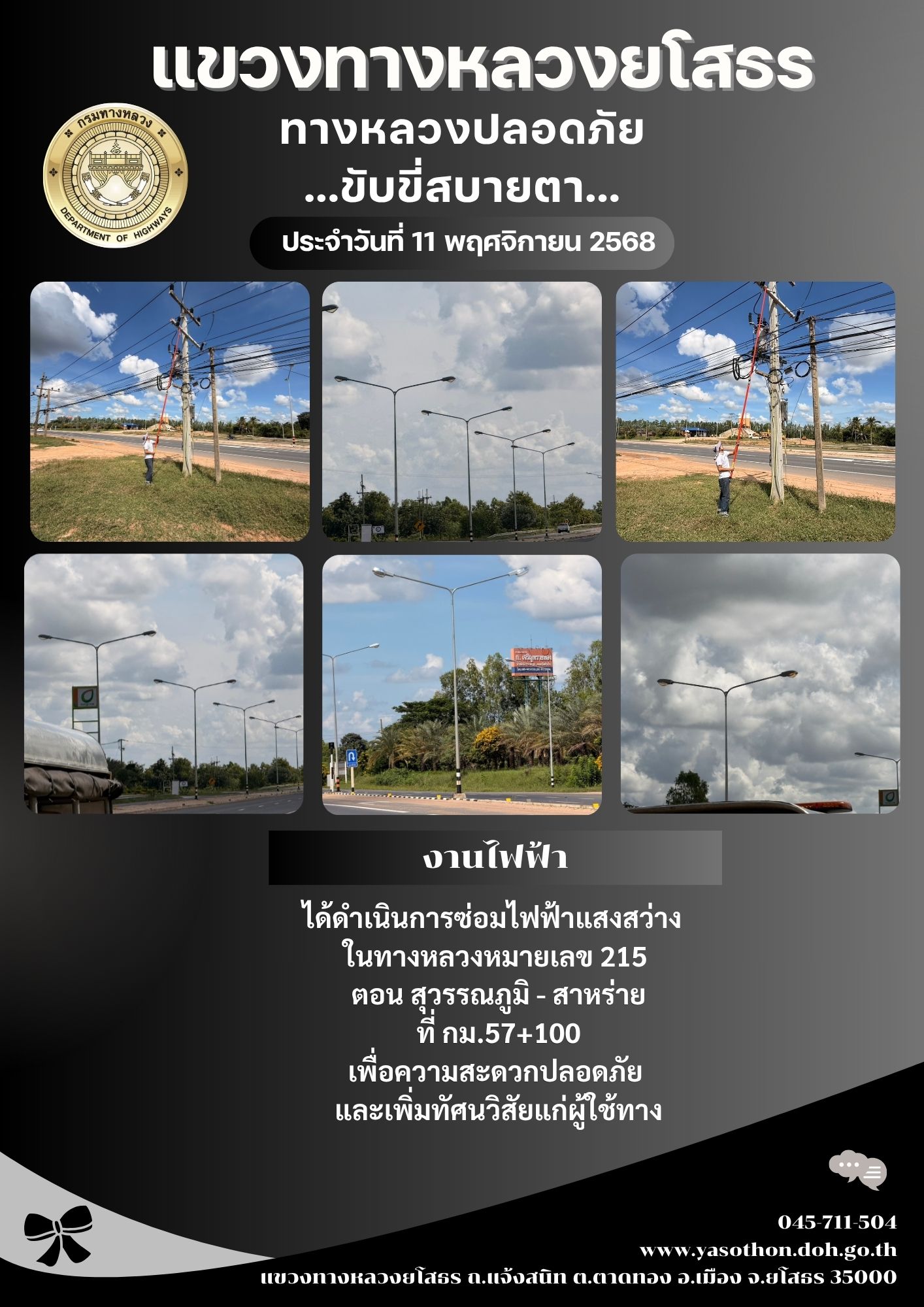 วันที่ 11 พฤศจิกายน 2568 งานไฟฟ้า ได้ดำเนินการซ่อมไฟฟ้าแสงสว่าง ในทางหลวงหมายเลข 215 ตอน สุวรรณภูมิ - สาหร่าย ที่ กม.57+100 เพื่อความสะดวกปลอดภัย และเพิ่มทัศนวิสัยแก่ผู้ใช้ทาง