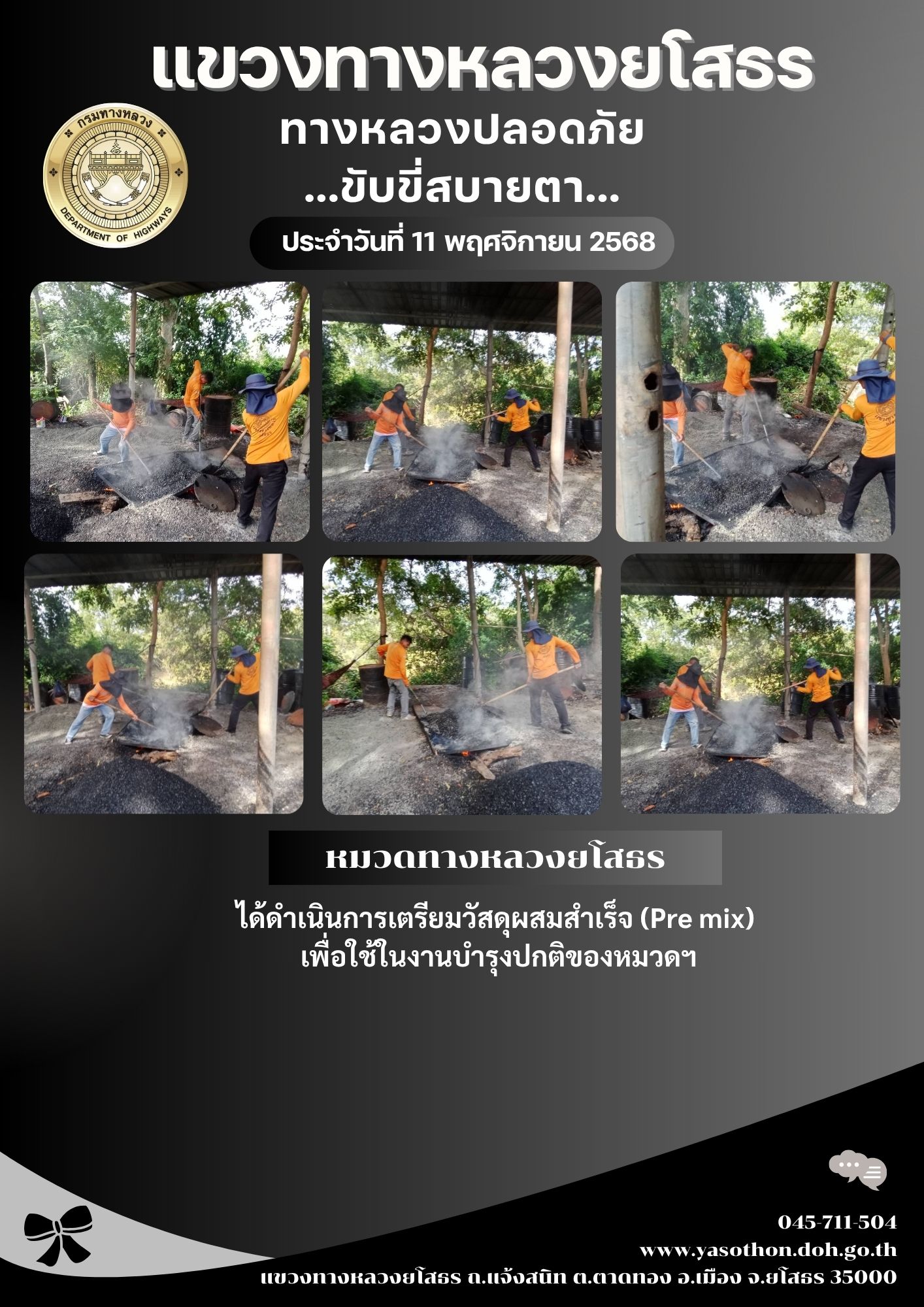 วันที่ 11 พฤศจิกายน 2568 หมวดทางหลวงยโสธร ได้ดำเนินการเตรียมวัสดุผสมสำเร็จ (Pre mix) เพื่อใช้ในงานบำรุงปกติของหมวดฯ