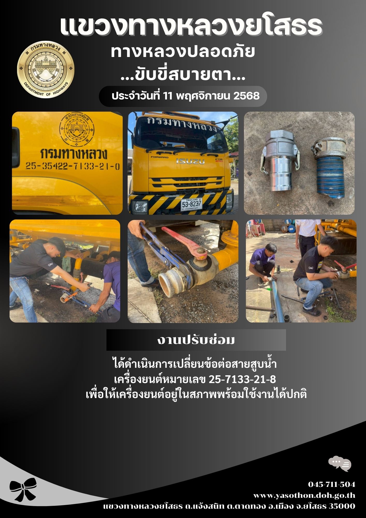 วันที่ 11 พฤศจิกายน 2568 งานปรับซ่อม ได้ดำเนินการเปลี่ยนข้อต่อสายสูบน้ำ เครื่องยนต์หมายเลข 25-7133-21-8 เพื่อให้เครื่องยนต์อยู่ในสภาพพร้อมใช้งานได้ปกติ