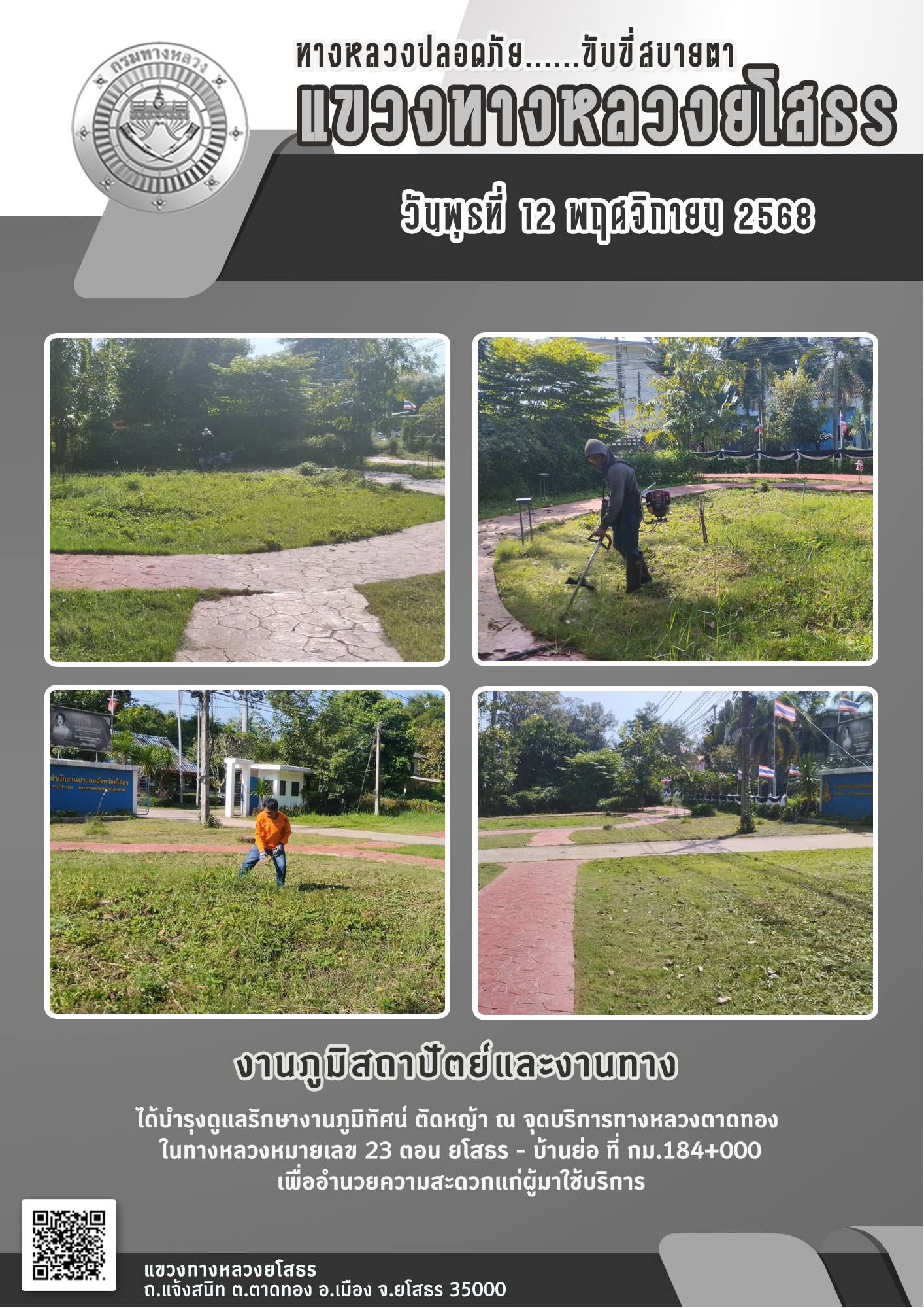วันพุธที่ 12 พฤศจิกายน 2568 งานภูมิสถาปัตย์และงานทาง ได้บำรุงดูแลรักษางานภูมิทัศน์ ตัดหญ้า ณ จุดบริการทางหลวงตาดทอง ในทางหลวงหมายเลข 23 ตอน ยโสธร - บ้านย่อ ที่ กม.184+000 เพื่ออำนวยความสะดวกแก่ผู้มาใช้บริการ