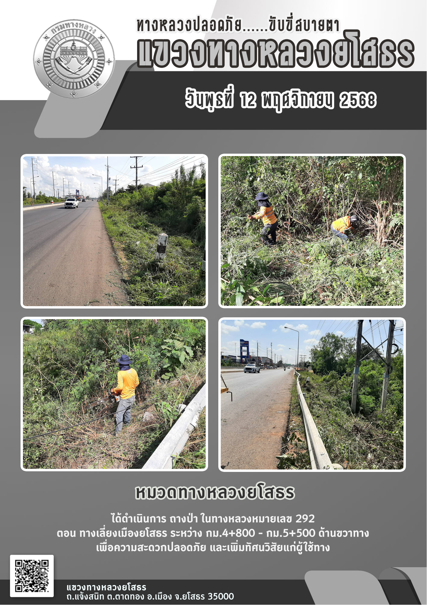 วันพุธที่ 12 พฤศจิกายน 2568 หมวดทางหลวงยโสธร ได้ดำเนินการ ถางป่า ในทางหลวงหมายเลข 292 ตอน ทางเลี่ยงเมืองยโสธร ระหว่าง กม.4+800 - กม.5+500 ด้านขวาทาง เพื่อความสะดวกปลอดภัย และเพิ่มทัศนวิสัยแก่ผู้ใช้ทาง