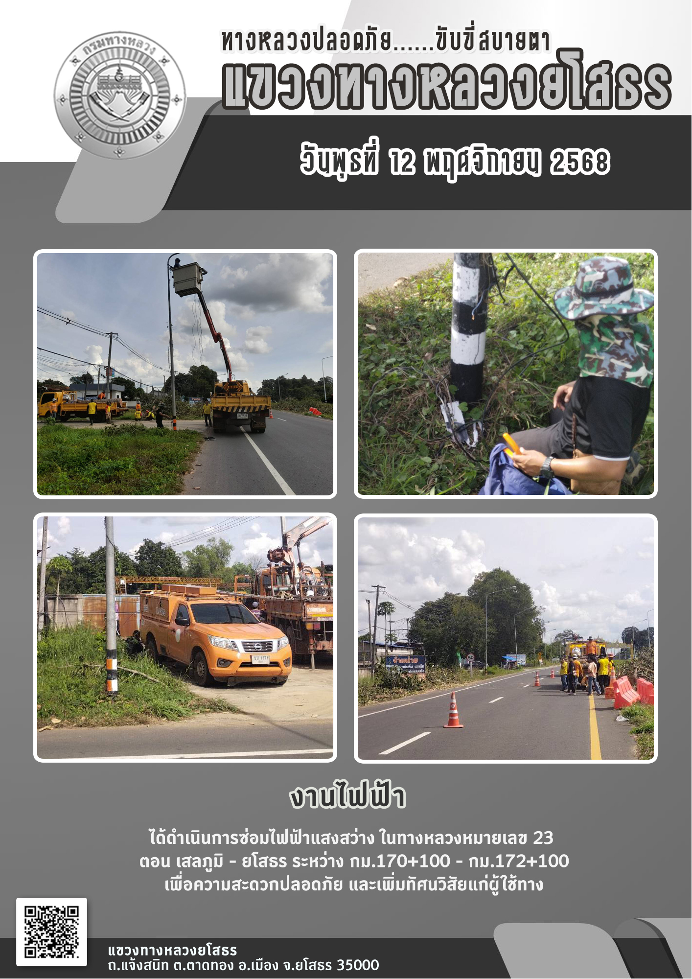 วันพุธที่ 12 พฤศจิกายน 2568 งานไฟฟ้า ได้ดำเนินการซ่อมไฟฟ้าแสงสว่าง ในทางหลวงหมายเลข 23 ตอน เสลภูมิ - ยโสธร ระหว่าง กม.170+100 - กม.172+100 เพื่อความสะดวกปลอดภัย และเพิ่มทัศนวิสัยแก่ผู้ใช้ทาง
