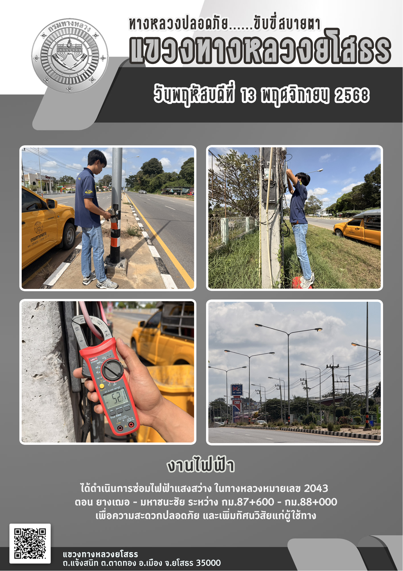 วันพฤหัสบดีที่ 13 พฤศจิกายน 2568 งานไฟฟ้า ได้ดำเนินการซ่อมไฟฟ้าแสงสว่าง ในทางหลวงหมายเลข 2043 ตอน ยางเฌอ - มหาชนะชัย ระหว่าง กม.87+600 - กม.88+000 เพื่อความสะดวกปลอดภัย และเพิ่มทัศนวิสัยแก่ผู้ใช้ทาง