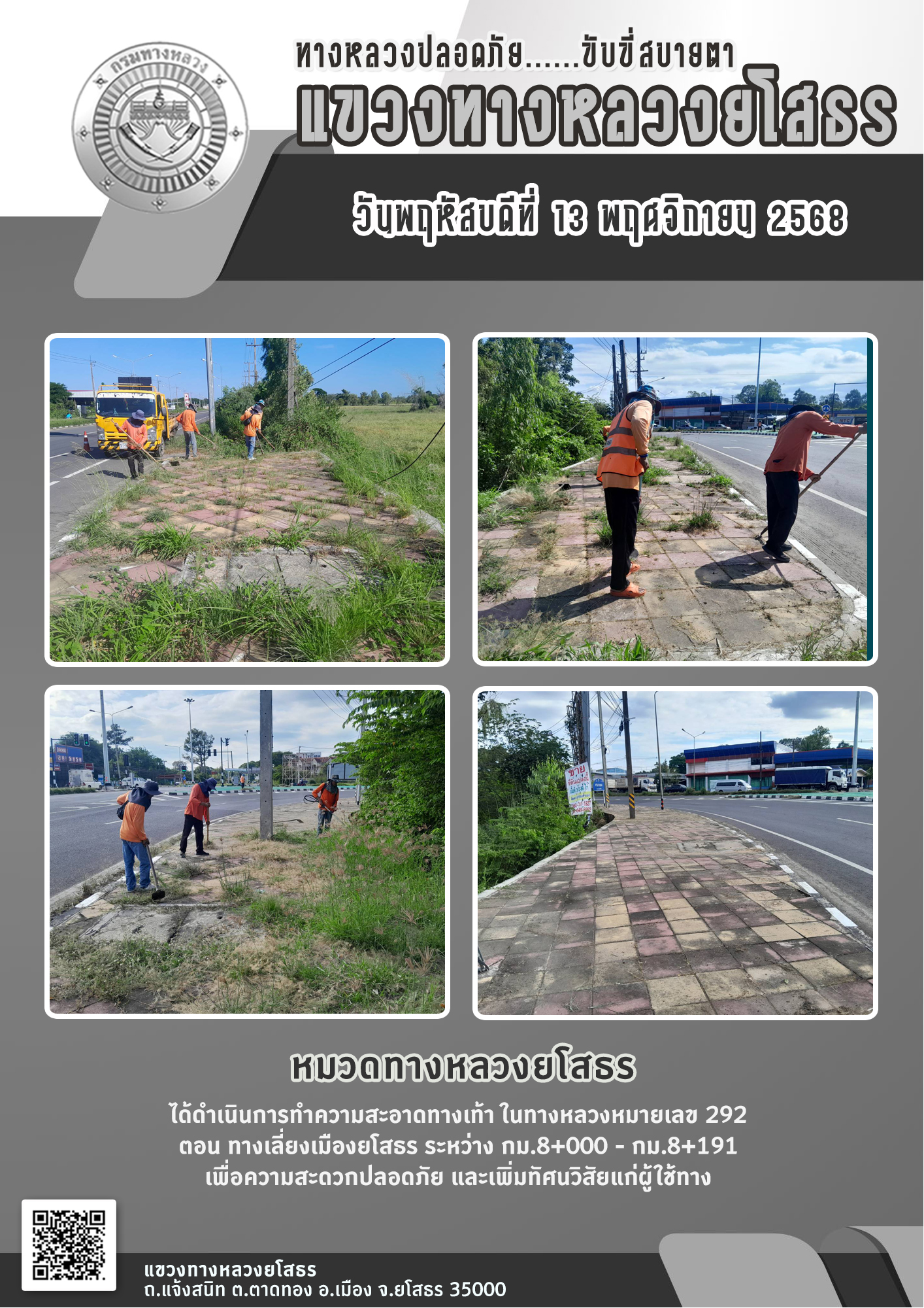 วันพฤหัสบดีที่ 13 พฤศจิกายน 2568 หมวดทางหลวงยโสธร ได้ดำเนินการทำความสะอาดทางเท้า ในทางหลวงหมายเลข 292 ตอน ทางเลี่ยงเมืองยโสธร ระหว่าง กม.8+000 - กม.8+191 เพื่อความสะดวกปลอดภัย และเพิ่มทัศนวิสัยแก่ผู้ใช้ทาง