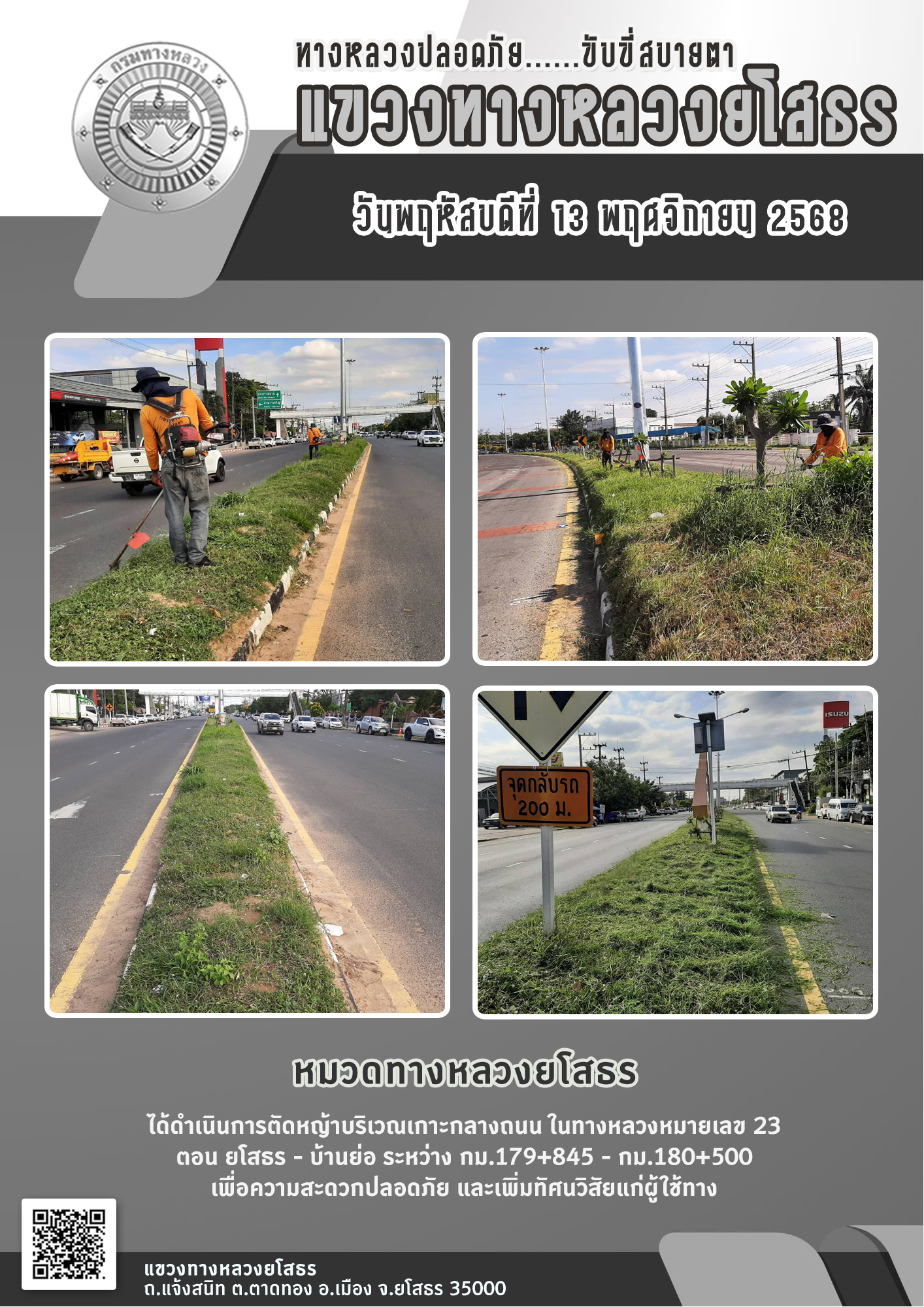 วันพฤหัสบดีที่ 13 พฤศจิกายน 2568 หมวดทางหลวงยโสธร ได้ดำเนินการตัดหญ้าบริเวณเกาะกลางถนน ในทางหลวงหมายเลข 23 ตอน ยโสธร - บ้านย่อ ระหว่าง กม.179+845 - กม.180+500 เพื่อความสะดวกปลอดภัย และเพิ่มทัศนวิสัยแก่ผู้ใช้ทาง