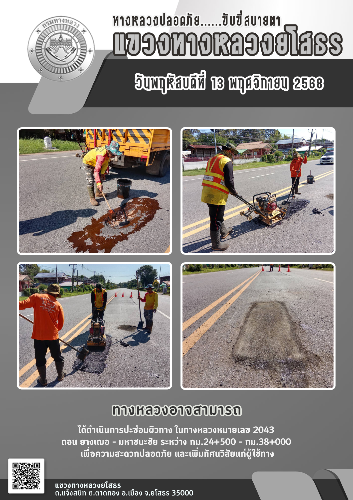 วันพฤหัสบดีที่ 13 พฤศจิกายน 2568 หมวดทางหลวงอาจสามารถ ได้ดำเนินการปะซ่อมผิวทาง ในทางหลวงหมายเลข 2043 ตอน ยางเฌอ - มหาชนะชัย ระหว่าง กม.24+500 - กม.38+000 เพื่อความสะดวกปลอดภัย และเพิ่มทัศนวิสัยแก่ผู้ใช้ทาง