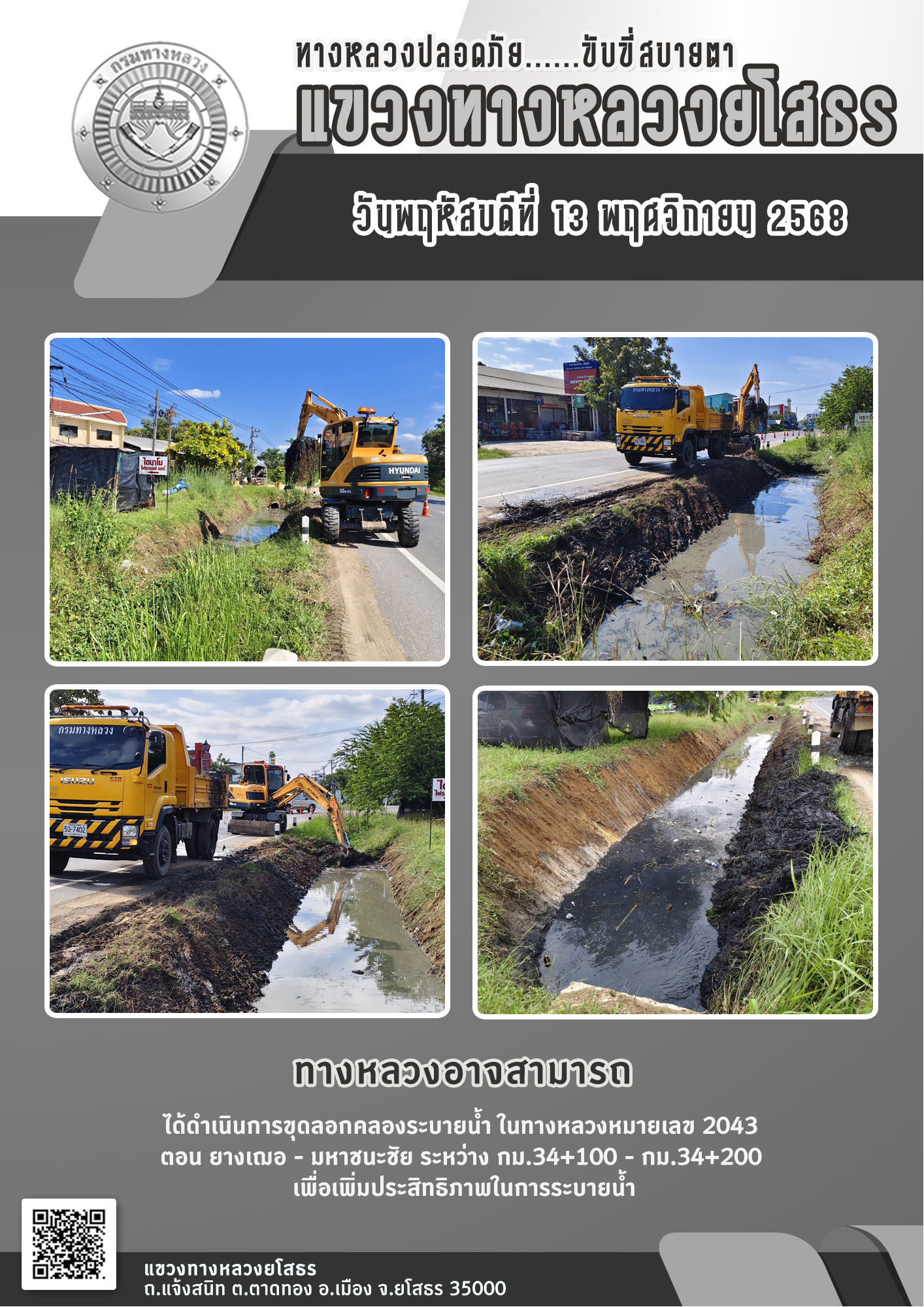วันพฤหัสบดีที่ 13 พฤศจิกายน 2568 หมวดทางหลวงอาจสามารถ ได้ดำเนินการขุดลอกคลองระบายน้ำ ในทางหลวงหมายเลข 2043 ตอน ยางเฌอ - มหาชนะชัย ระหว่าง กม.34+100 - กม.34+200 เพื่อเพิ่มประสิทธิภาพในการระบายน้ำ