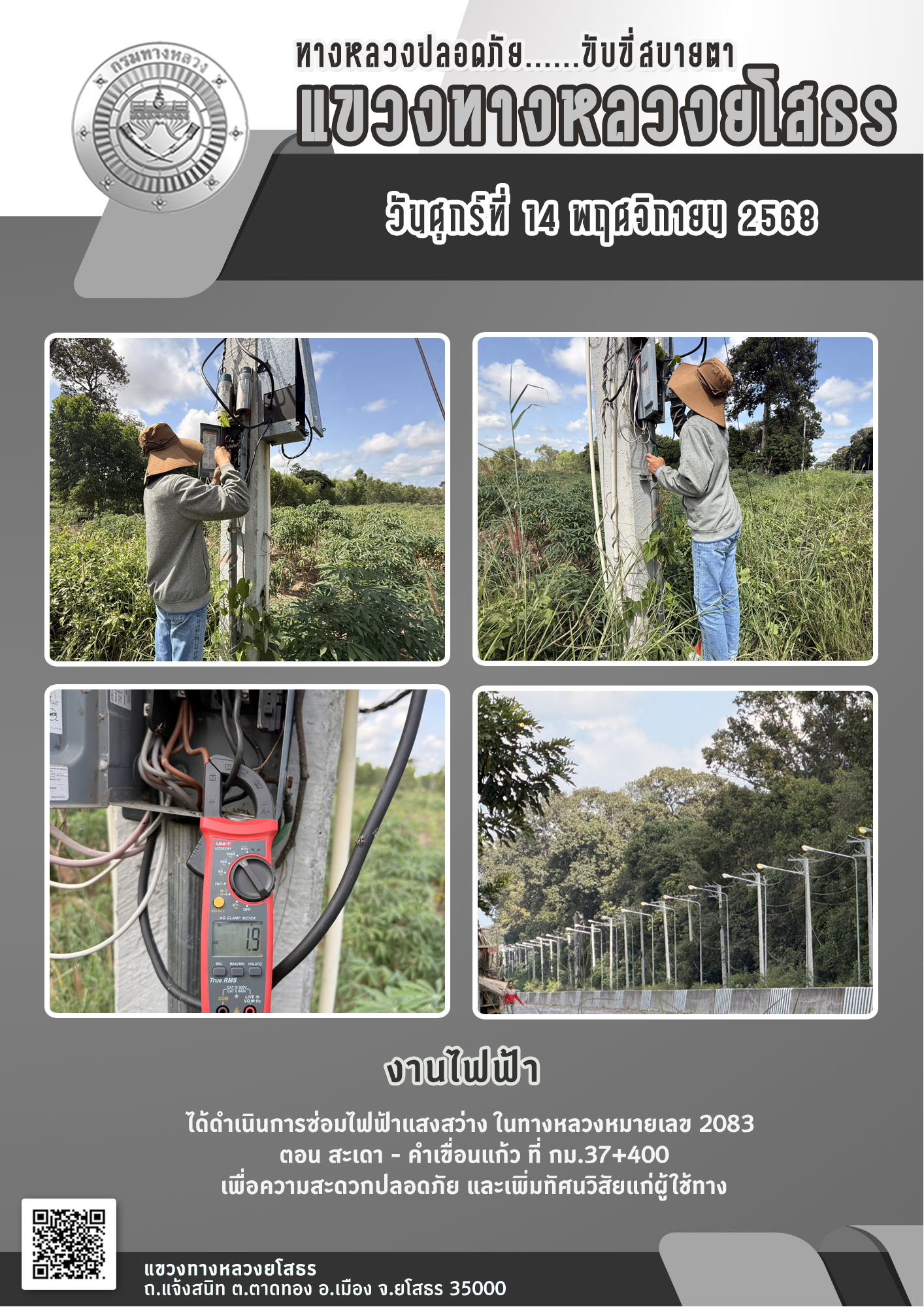 วันศุกร์ที่ 14 พฤศจิกายน 2568 งานไฟฟ้า ได้ดำเนินการซ่อมไฟฟ้าแสงสว่าง ในทางหลวงหมายเลข 2083 ตอน สะเดา - คำเขื่อนแก้ว ที่ กม.37+400 เพื่อความสะดวกปลอดภัย และเพิ่มทัศนวิสัยแก่ผู้ใช้ทาง