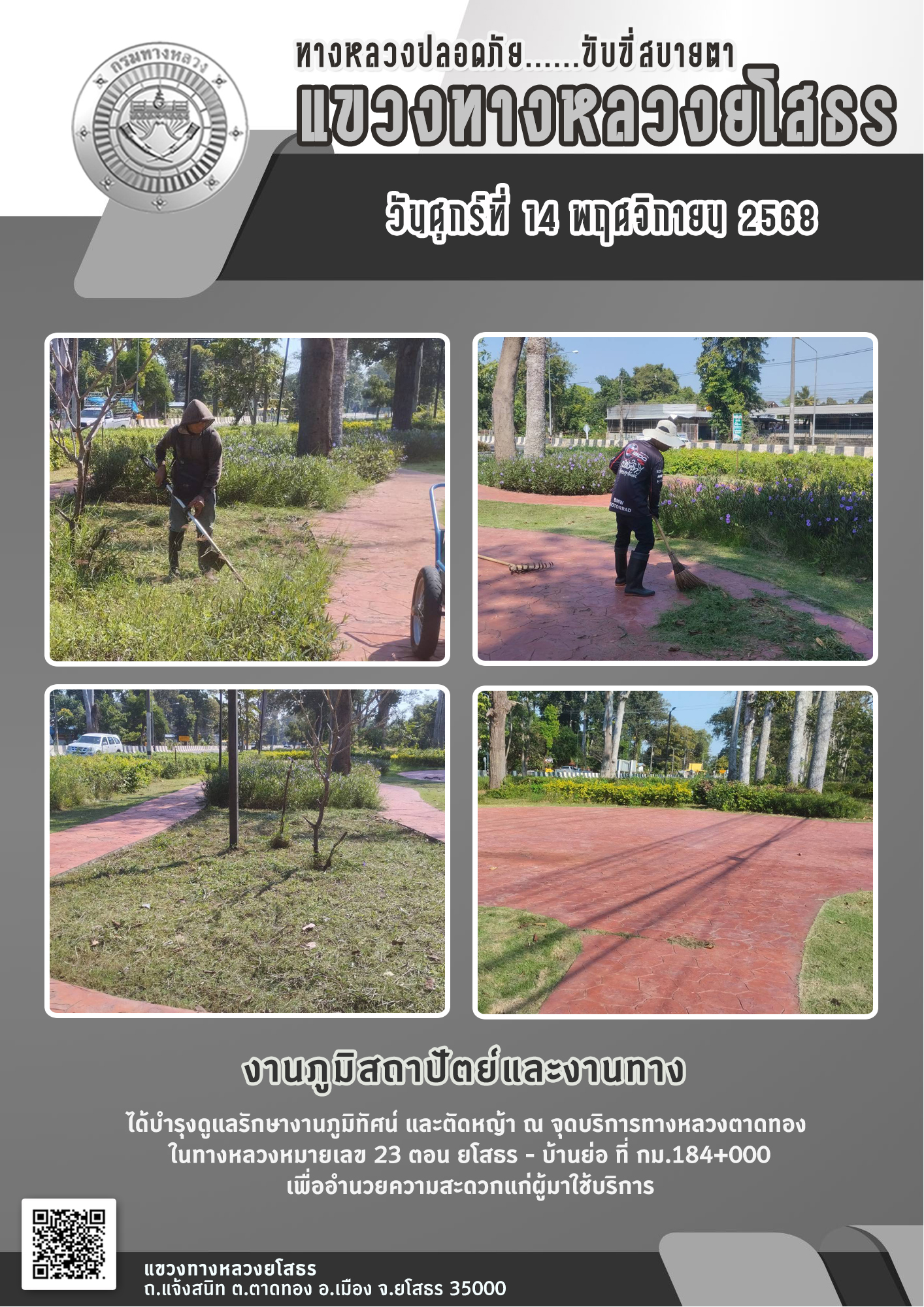 วันศุกร์ที่ 14 พฤศจิกายน 2568 งานภูมิสถาปัตย์และงานทาง ได้บำรุงดูแลรักษางานภูมิทัศน์ และตัดหญ้า ณ จุดบริการทางหลวงตาดทอง ในทางหลวงหมายเลข 23 ตอน ยโสธร - บ้านย่อ ที่ กม.184+000 เพื่ออำนวยความสะดวกแก่ผู้มาใช้บริการ