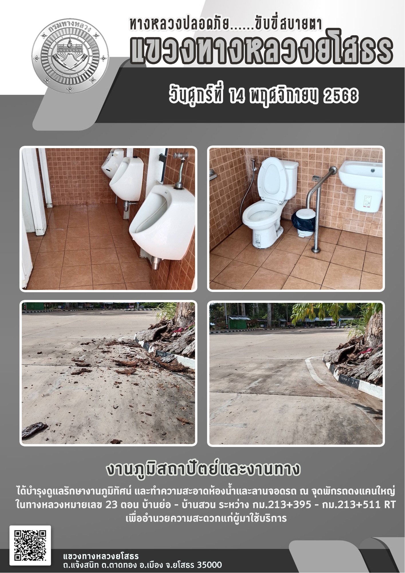 วันศุกร์ที่ 14 พฤศจิกายน 2568 งานภูมิสถาปัตย์และงานทาง ได้บำรุงดูแลรักษางานภูมิทัศน์ และทำความสะอาดห้องน้ำและลานจอดรถ ณ จุดพักรถดงแคนใหญ่ ในทางหลวงหมายเลข 23 ตอน บ้านย่อ - บ้านสวน ระหว่าง กม.213+395 - กม.213+511 RT เพื่ออำนวยความสะดวกแก่ผู้มาใช้บริกา