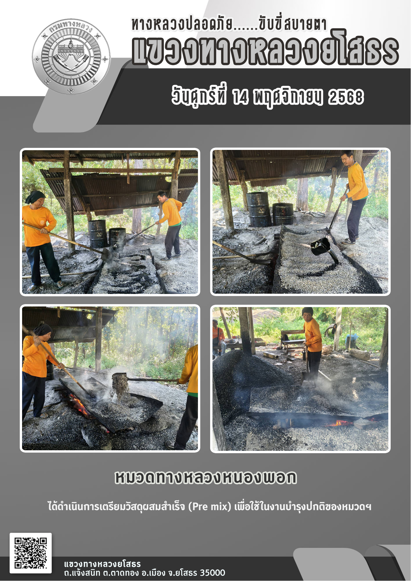 วันศุกร์ที่ 14 พฤศจิกายน 2568 หมวดทางหลวงหนองพอก ได้ดำเนินการเตรียมวัสดุผสมสำเร็จ (Pre mix) เพื่อใช้ในงานบำรุงปกติของหมวดฯ