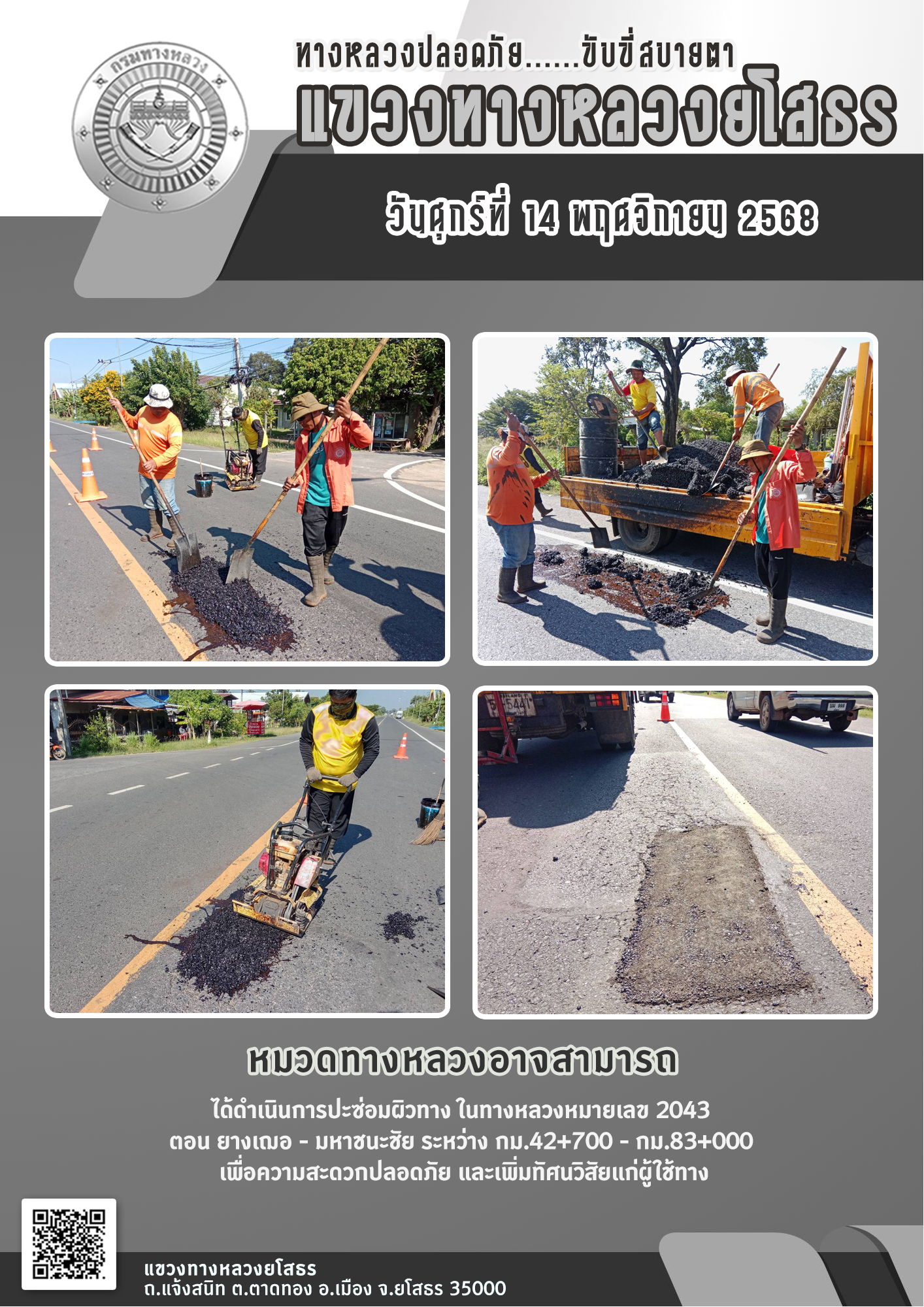 วันศุกร์ที่ 14 พฤศจิกายน 2568 หมวดทางหลวงอาจสามารถ ได้ดำเนินการปะซ่อมผิวทาง ในทางหลวงหมายเลข 2043 ตอน ยางเฌอ - มหาชนะชัย ระหว่าง กม.42+700 - กม.83+000 เพื่อความสะดวกปลอดภัย และเพิ่มทัศนวิสัยแก่ผู้ใช้ทาง