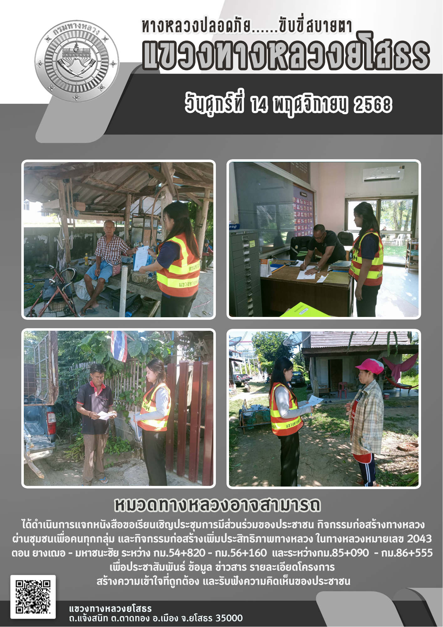 วันศุกร์ที่ 14 พฤศจิกายน 2568 หมวดทางหลวงอาจสามารถ ได้ดำเนินการแจกหนังสือขอเรียนเชิญประชุมการมีส่วนร่วมของประชาชน ในทางหลวงหมายเลข 2043 ตอน ยางเฌอ - มหาชนะชัย ระหว่าง กม.54+820 - กม.56+160 และ ทล.85+090 - กม.86+555 เพื่อประชาสัมพันธ์ ข้อมูล ข่าวสาร ร