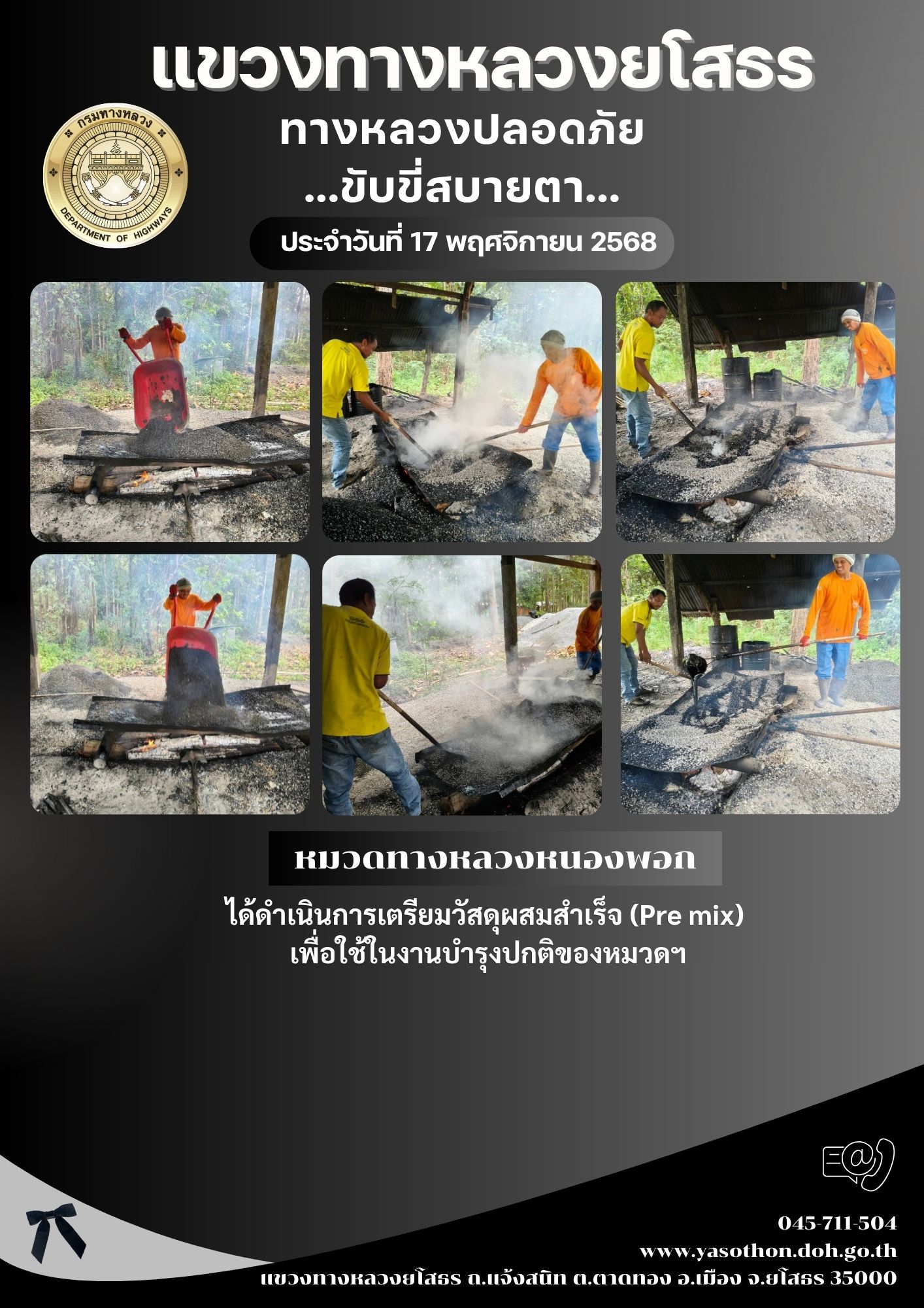 วันที่ 17 พฤศจิกายน 2568 หมวดทางหลวงหนองพอก ได้ดำเนินการเตรียมวัสดุผสมสำเร็จ (Pre mix) เพื่อใช้ในงานบำรุงปกติของหมวดฯ