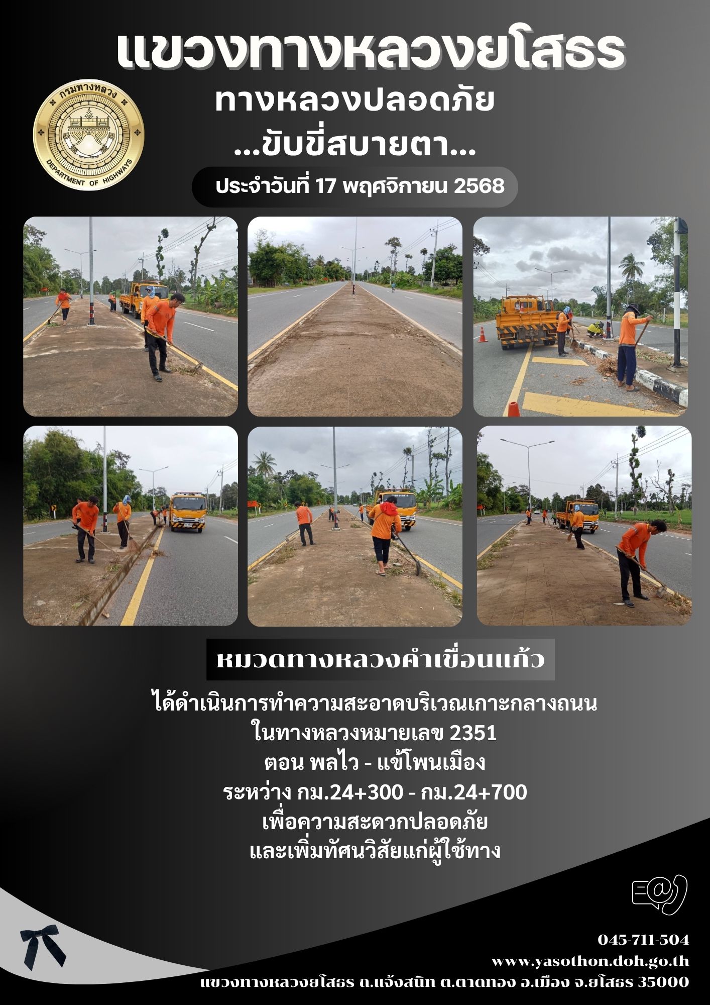 วันที่ 17 พฤศจิกายน 2568 หมวดทางหลวงคำเขื่อนแก้ว ได้ดำเนินการทำความสะอาดบริเวณเกาะกลางถนน ในทางหลวงหมายเลข 2351 ตอน พลไว - แข้โพนเมือง ระหว่าง กม.24+300 - กม.24+700 เพื่อความสะดวกปลอดภัย และเพิ่มทัศนวิสัยแก่ผู้ใช้ทาง