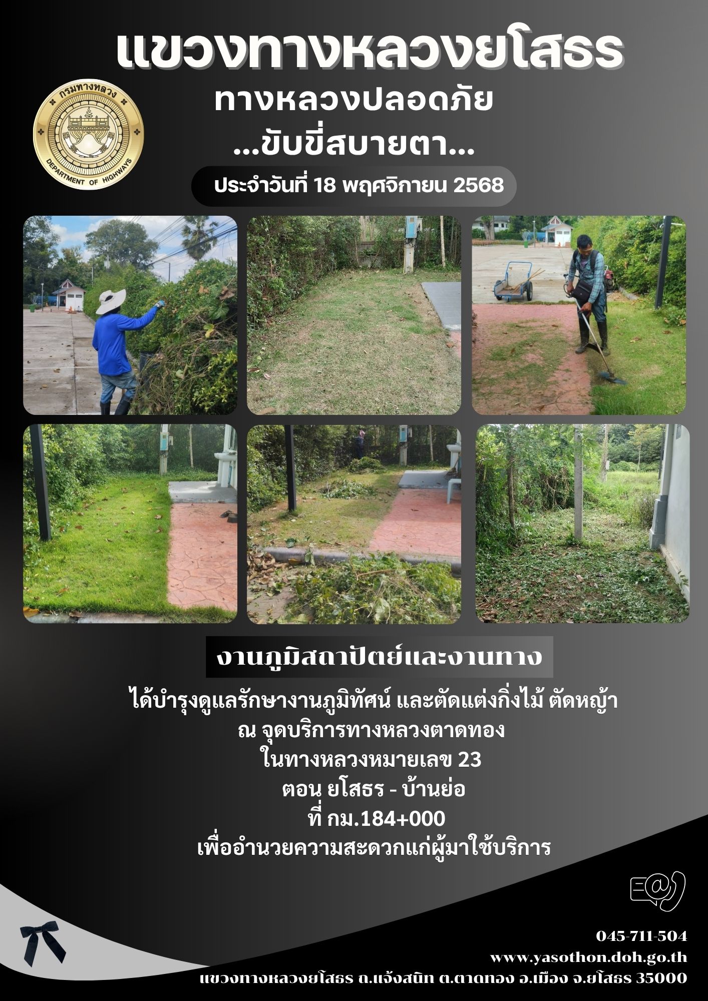 วันที่ 18 พฤศจิกายน 2568 งานภูมิสถาปัตย์และงานทาง ได้บำรุงดูแลรักษางานภูมิทัศน์ และตัดแต่งกิ่งไม้ ตัดหญ้า ณ จุดบริการทางหลวงตาดทอง ในทางหลวงหมายเลข 23 ตอน ยโสธร - บ้านย่อ ที่ กม.184+000 เพื่ออำนวยความสะดวกแก่ผู้มาใช้บริการ
