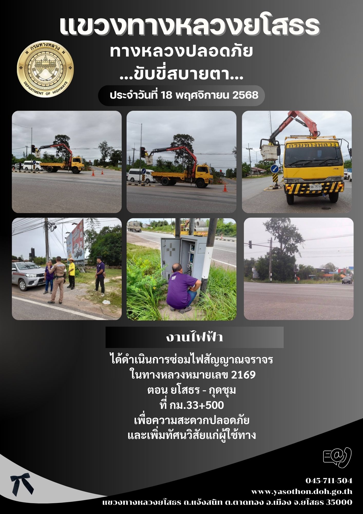 วันที่ 18 พฤศจิกายน 2568 งานไฟฟ้า ได้ดำเนินการซ่อมไฟสัญญาณจราจร ในทางหลวงหมายเลข 2169 ตอน ยโสธร - กุดชุม ที่ กม.33+500 เพื่อความสะดวกปลอดภัย และเพิ่มทัศนวิสัยแก่ผู้ใช้ทาง