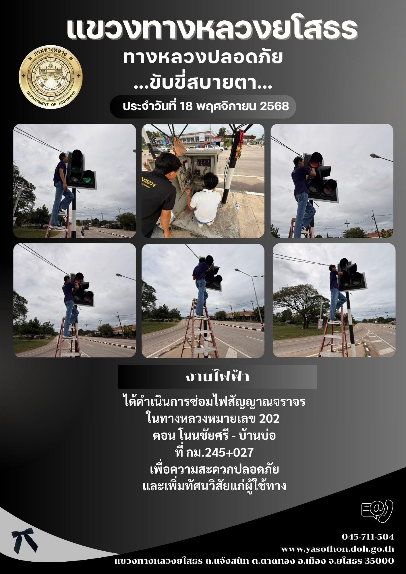 วันที่ 18 พฤศจิกายน 2568 งานไฟฟ้า ได้ดำเนินการซ่อมไฟสัญญาณจราจร ในทางหลวงหมายเลข 202 ตอน โนนชัยศรี - บ้านบ่อ ที่ กม.245+027 เพื่อความสะดวกปลอดภัย และเพิ่มทัศนวิสัยแก่ผู้ใช้ทาง