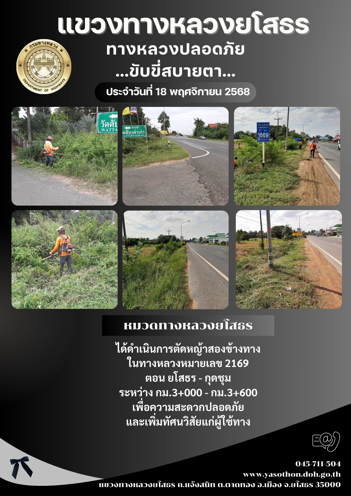วันที่ 18 พฤศจิกายน 2568 หมวดทางหลวงยโสธร ได้ดำเนินการตัดหญ้าสองข้างทาง ในทางหลวงหมายเลข 2169 ตอน ยโสธร - กุดชุม ระหว่าง กม.3+000 - กม.3+600 เพื่อความสะดวกปลอดภัย และเพิ่มทัศนวิสัยแก่ผู้ใช้ทาง