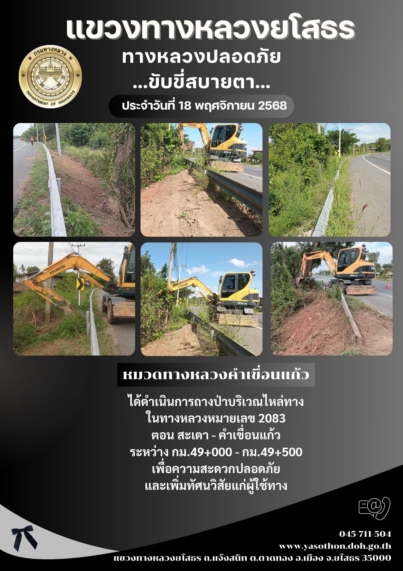 วันที่ 18 พฤศจิกายน 2568 หมวดทางหลวงคำเขื่อนแก้ว ได้ดำเนินการถางป่าบริเวณไหล่ทาง ในทางหลวงหมายเลข 2083 ตอน สะเดา - คำเขื่อนแก้ว ระหว่าง กม.49+000 - กม.49+500 เพื่อความสะดวกปลอดภัย และเพิ่มทัศนวิสัยแก่ผู้ใช้ทาง