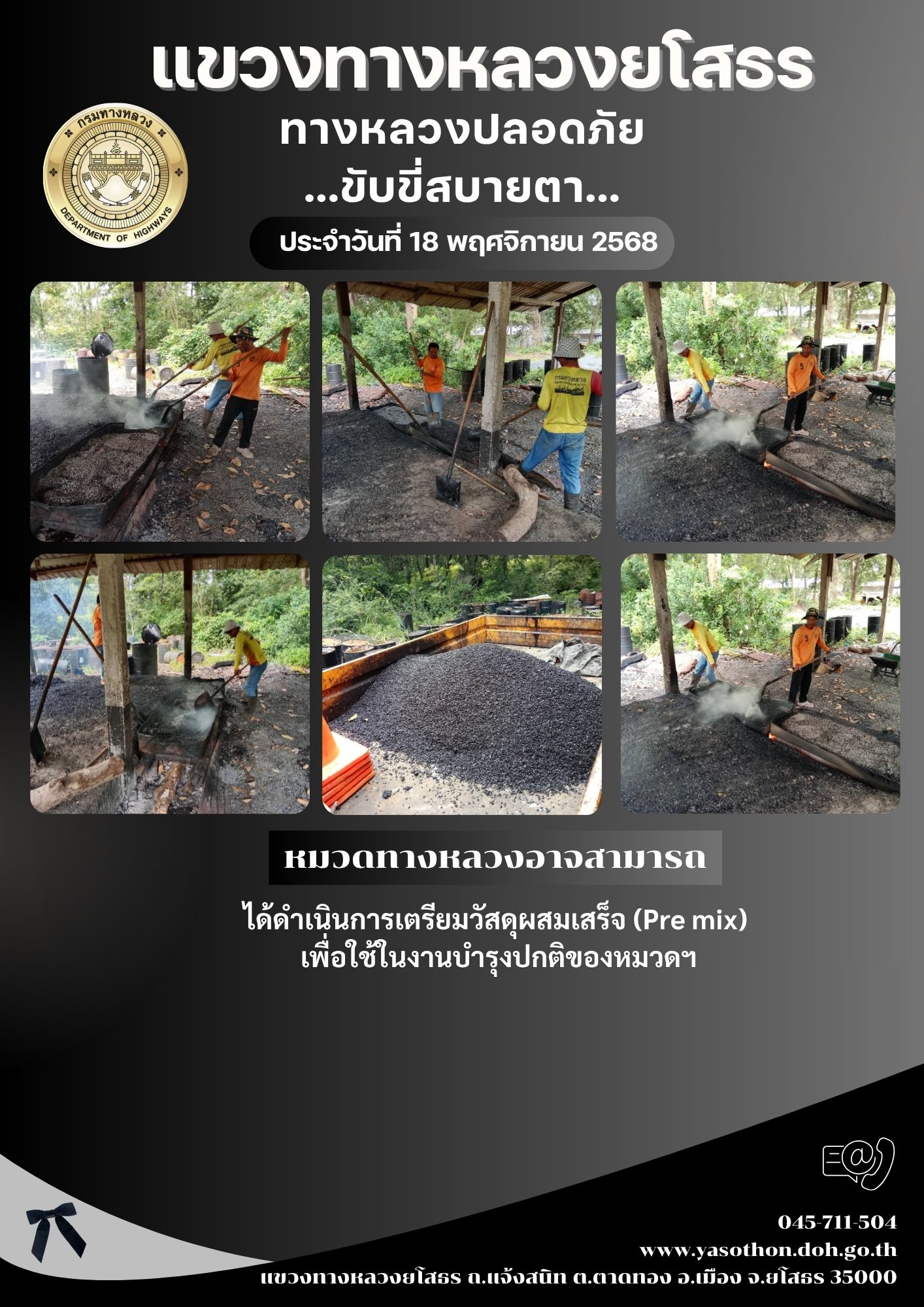 วันที่ 18 พฤศจิกายน 2568 หมวดทางหลวงอาจสามารถ ได้ดำเนินการเตรียมวัสดุผสมเสร็จ (Pre mix) เพื่อใช้ในงานบำรุงปกติของหมวดฯ