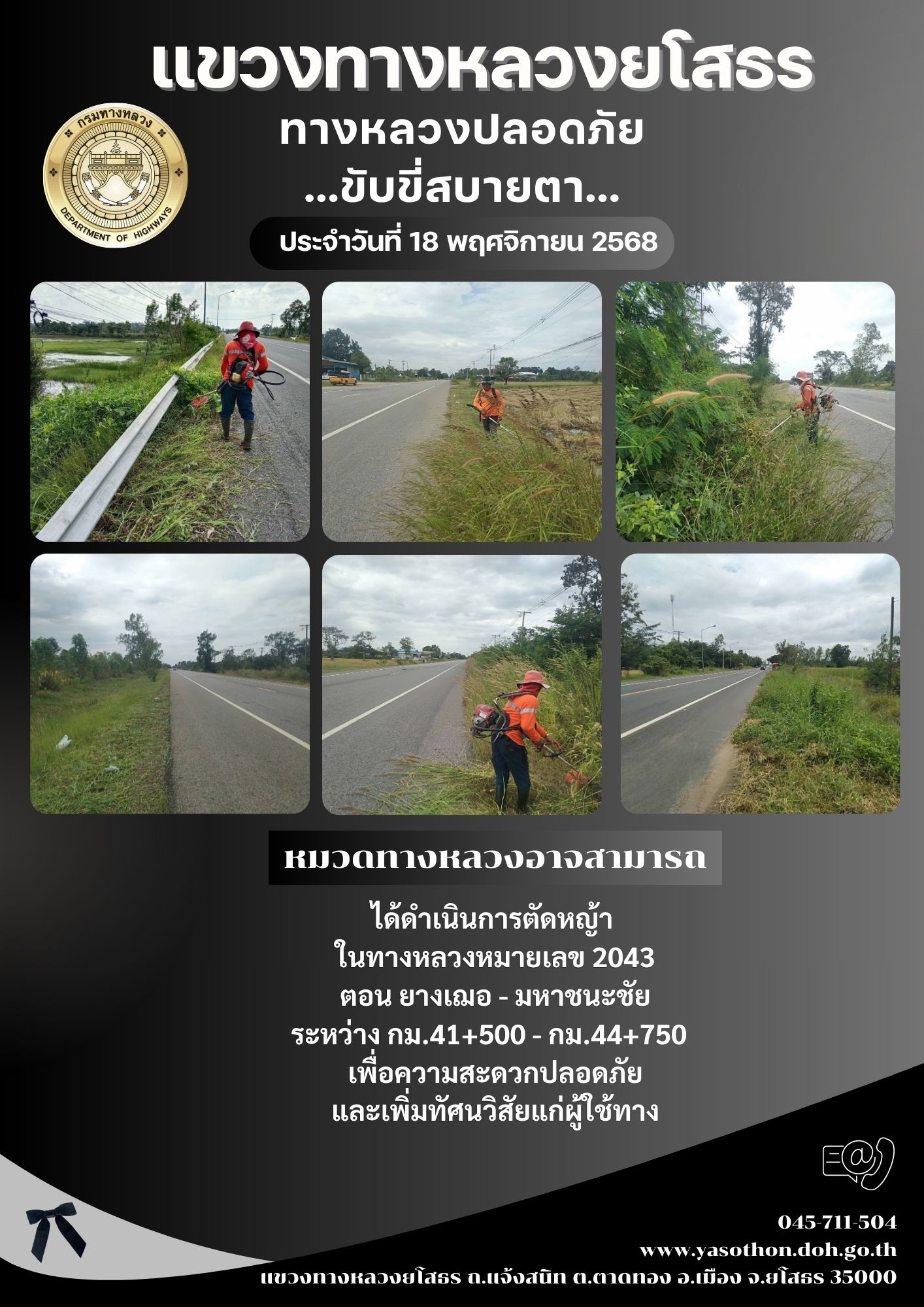 วันที่ 18 พฤศจิกายน 2568 หมวดทางหลวงอาจสามารถ ได้ดำเนินการตัดหญ้า ในทางหลวงหมายเลข 2043 ตอน ยางเฌอ - มหาชนะชัย ระหว่าง กม.41+500 - กม.44+750 เพื่อความสะดวกปลอดภัย และเพิ่มทัศนวิสัยแก่ผู้ใช้ทาง