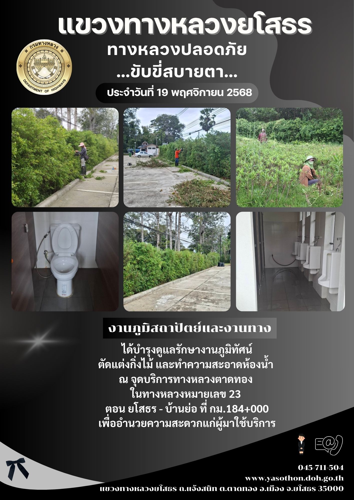 วันที่ 19 พฤศจิกายน 2568 งานภูมิสถาปัตย์และงานทาง ได้บำรุงดูแลรักษางานภูมิทัศน์ ตัดแต่งกิ่งไม้ และทำความสะอาดห้องน้ำ ณ จุดบริการทางหลวงตาดทอง ในทางหลวงหมายเลข 23 ตอน ยโสธร - บ้านย่อ ที่ กม.184+000 เพื่ออำนวยความสะดวกแก่ผู้มาใช้บริการ