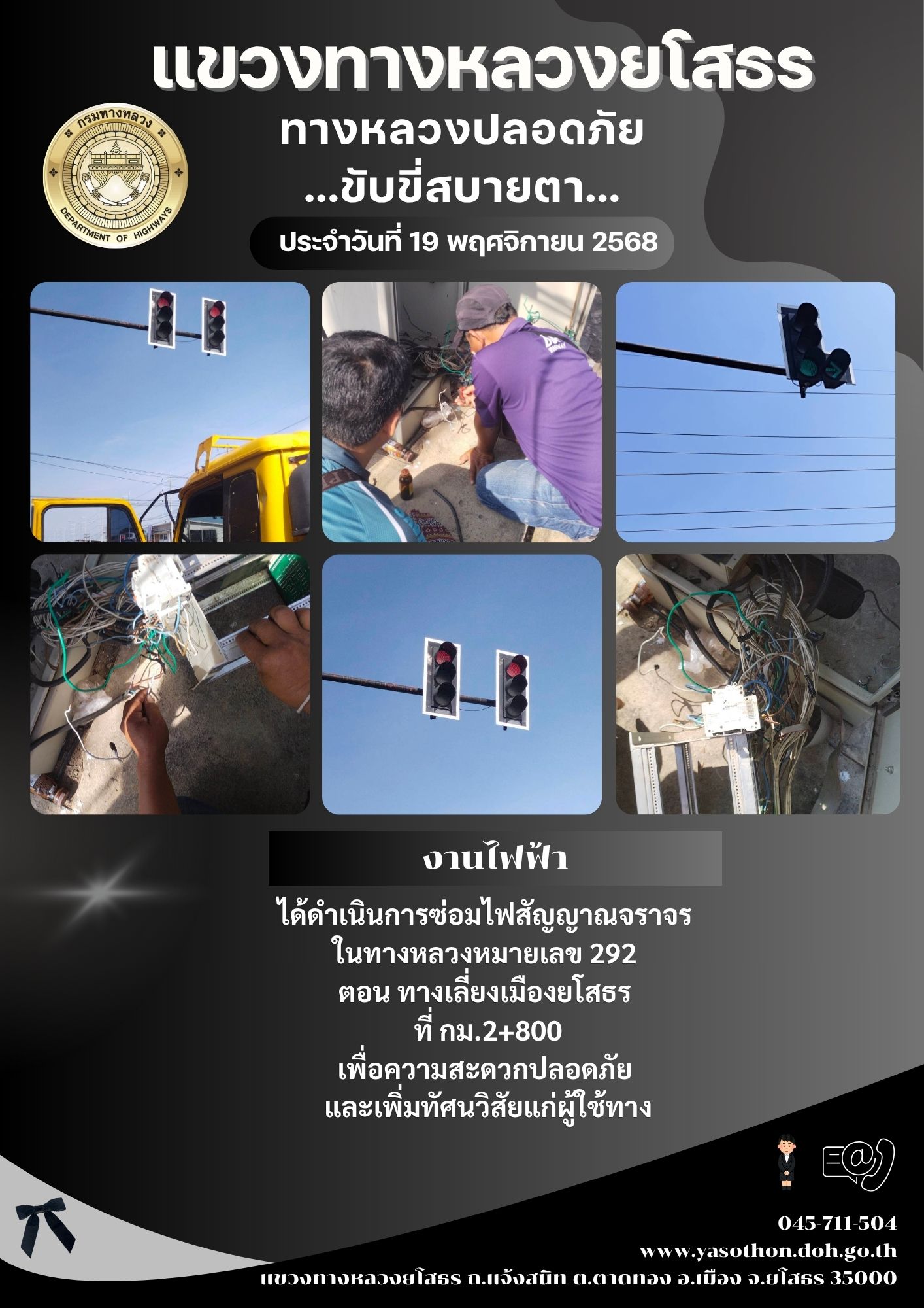 วันที่ 19 พฤศจิกายน 2568 งานไฟฟ้า ได้ดำเนินการซ่อมไฟสัญญาณจราจร ในทางหลวงหมายเลข 292 ตอน ทางเลี่ยงเมืองยโสธร ที่ กม.2+800 เพื่อความสะดวกปลอดภัย และเพิ่มทัศนวิสัยแก่ผู้ใช้ทาง