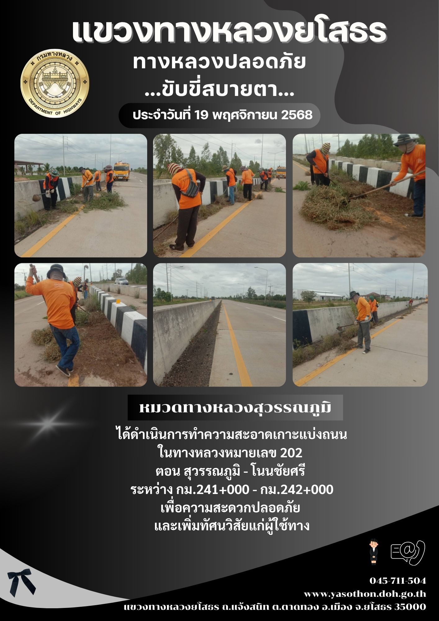 วันที่ 19 พฤศจิกายน 2568 หมวดทางหลวงสุวรรณภูมิ ได้ดำเนินการทำความสะอาดเกาะแบ่งถนน ในทางหลวงหมายเลข 202 ตอน สุวรรณภูมิ - โนนชัยศรี ระหว่าง กม.241+000 - กม.242+000 เพื่อความสะดวกปลอดภัย และเพิ่มทัศนวิสัยแก่ผู้ใช้ทาง