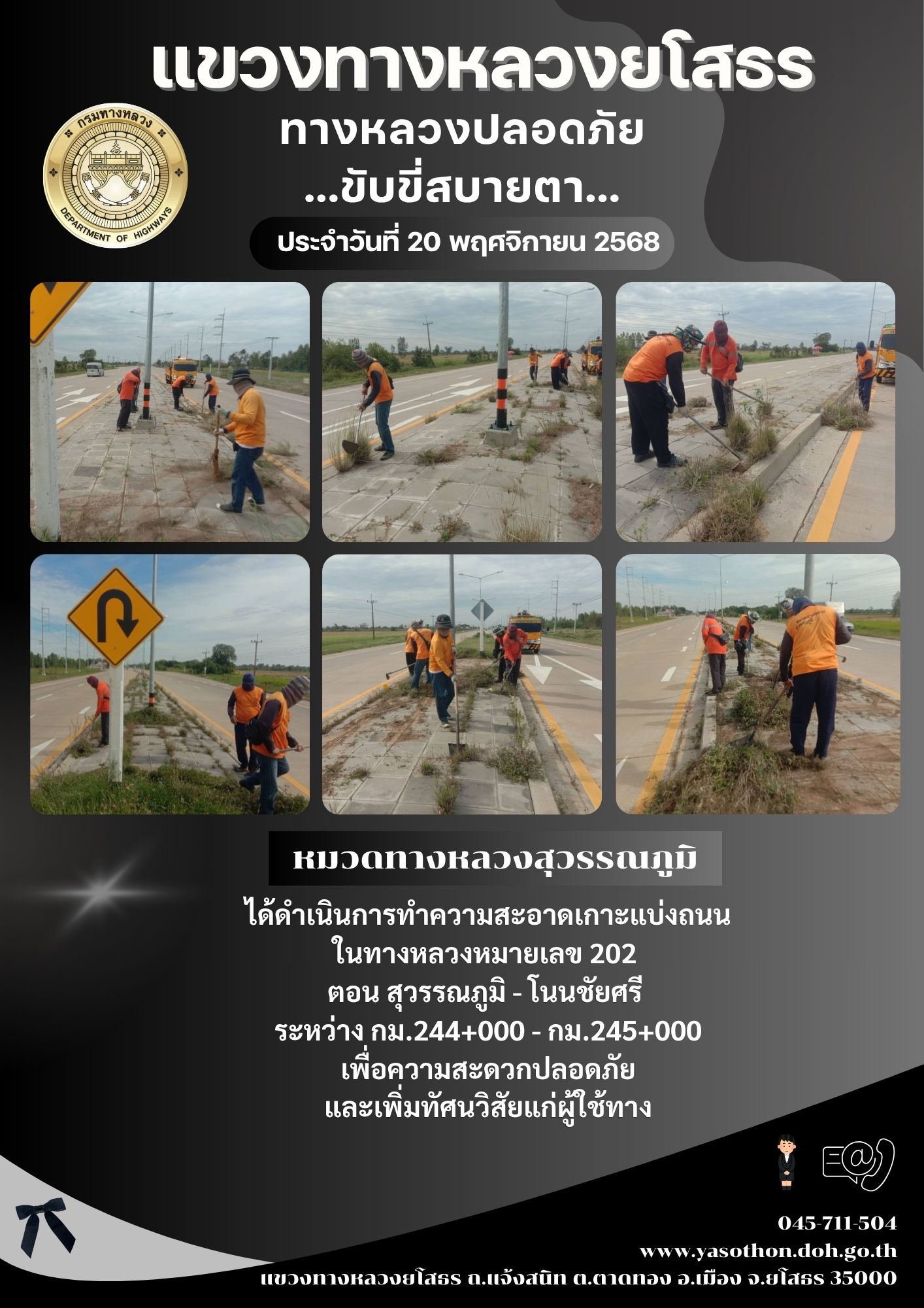 วันที่ 20 พฤศจิกายน 2568 หมวดทางหลวงสุวรรณภูมิ ได้ดำเนินการทำความสะอาดเกาะแบ่งถนน ในทางหลวงหมายเลข 202 ตอน สุวรรณภูมิ - โนนชัยศรี ระหว่าง กม.244+000 - กม.245+000 เพื่อความสะดวกปลอดภัย และเพิ่มทัศนวิสัยแก่ผู้ใช้ทาง