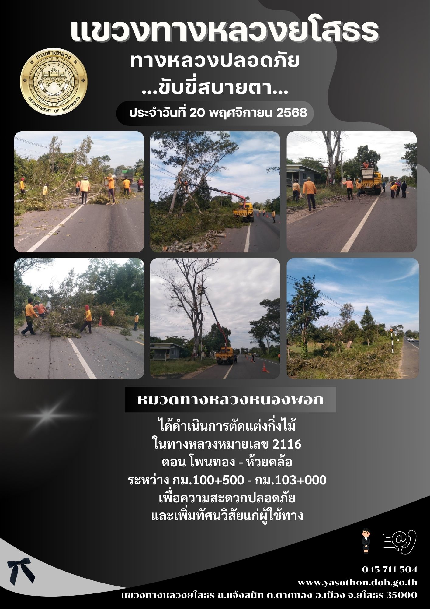วันที่ 20 พฤศจิกายน 2568 หมวดทางหลวงหนองพอก ได้ดำเนินการตัดแต่งกิ่งไม้ ในทางหลวงหมายเลข 2116 ตอน โพนทอง - ห้วยคล้อ ระหว่าง กม.100+500 - กม.103+000 เพื่อความสะดวกปลอดภัย และเพิ่มทัศนวิสัยแก่ผู้ใช้ทาง
