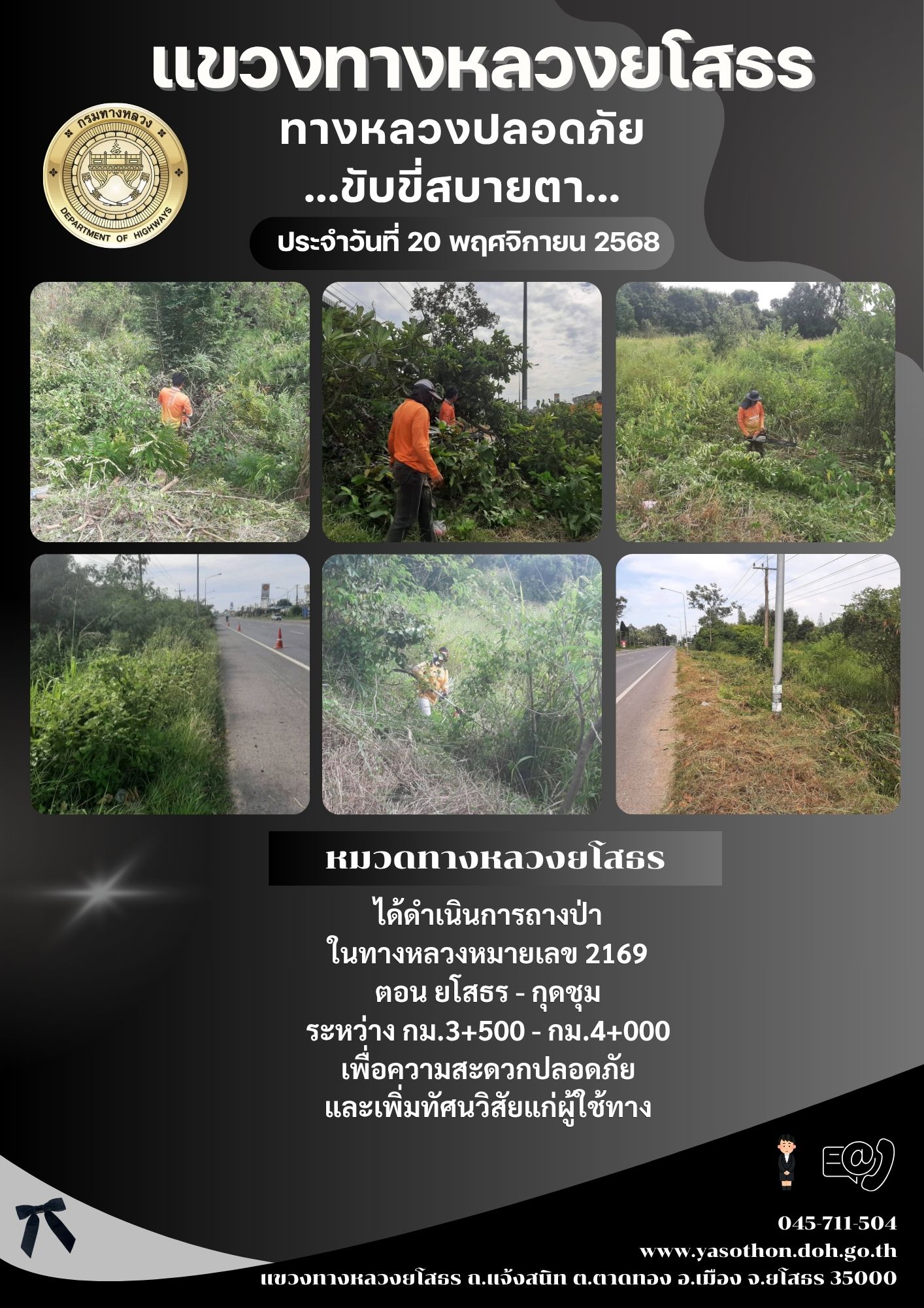 วันที่ 20 พฤศจิกายน 2568 หมวดทางหลวงยโสธร ได้ดำเนินการถางป่า ในทางหลวงหมายเลข 2169 ตอน ยโสธร - กุดชุม ระหว่าง กม.3+500 - กม.4+000 เพื่อความสะดวกปลอดภัย และเพิ่มทัศนวิสัยแก่ผู้ใช้ทาง