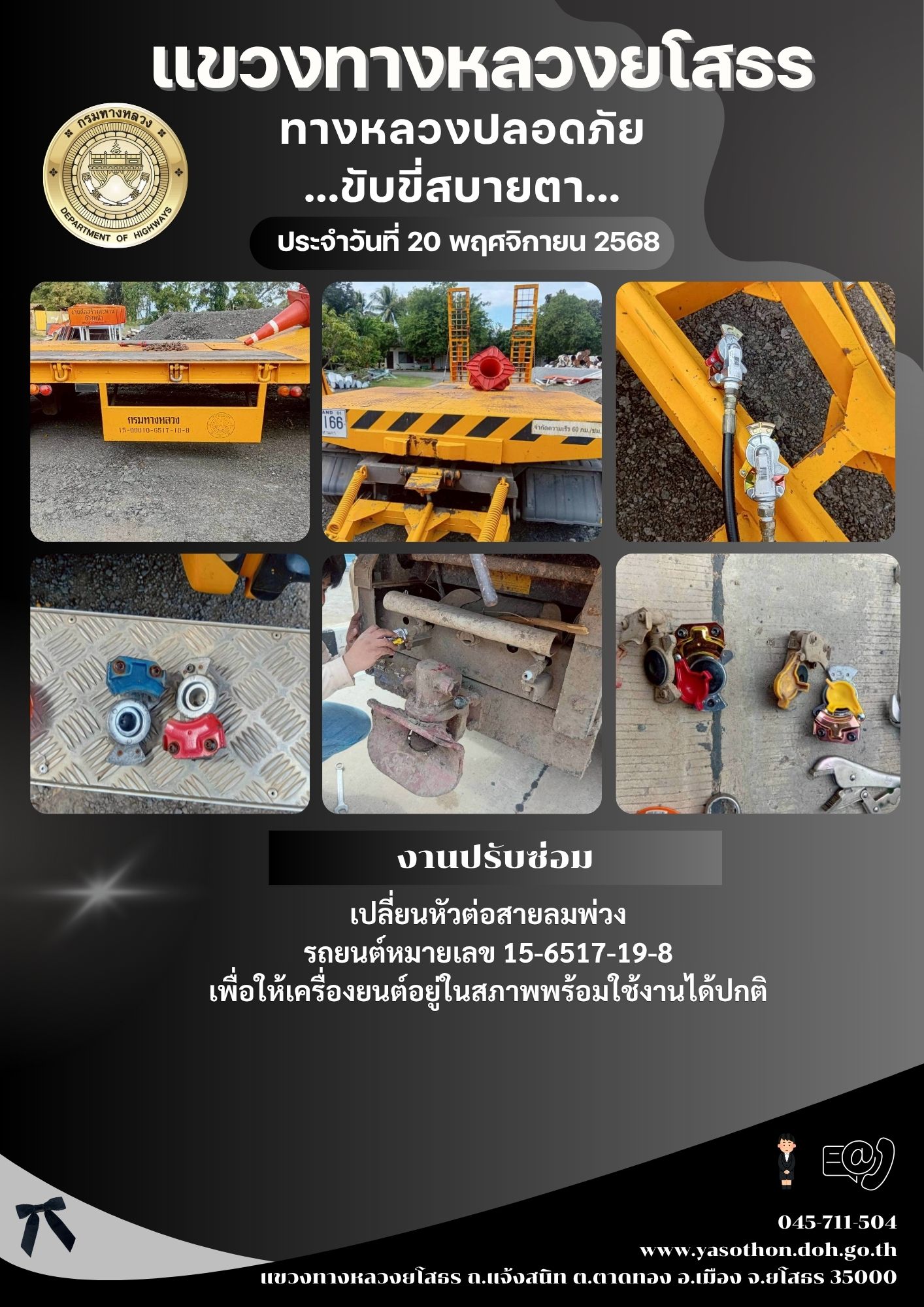 วันที่ 20 พฤศจิกายน 2568 งานปรับซ่อม เปลี่ยนหัวต่อสายลมพ่วง รถยนต์หมายเลข 15-6517-19-8 เพื่อให้เครื่องยนต์อยู่ในสภาพพร้อมใช้งานได้ปกติ