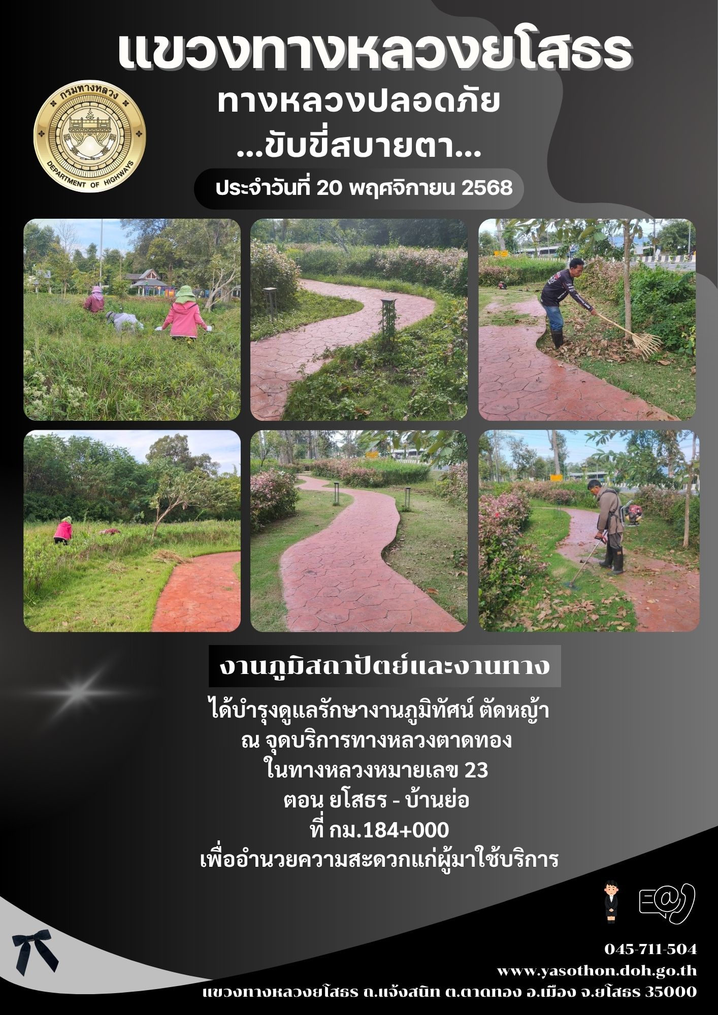 วันที่ 20 พฤศจิกายน 2568 งานภูมิสถาปัตย์และงานทาง ได้บำรุงดูแลรักษางานภูมิทัศน์ ตัดหญ้า ณ จุดบริการทางหลวงตาดทอง ในทางหลวงหมายเลข 23 ตอน ยโสธร - บ้านย่อ ที่ กม.184+000 เพื่ออำนวยความสะดวกแก่ผู้มาใช้บริการ